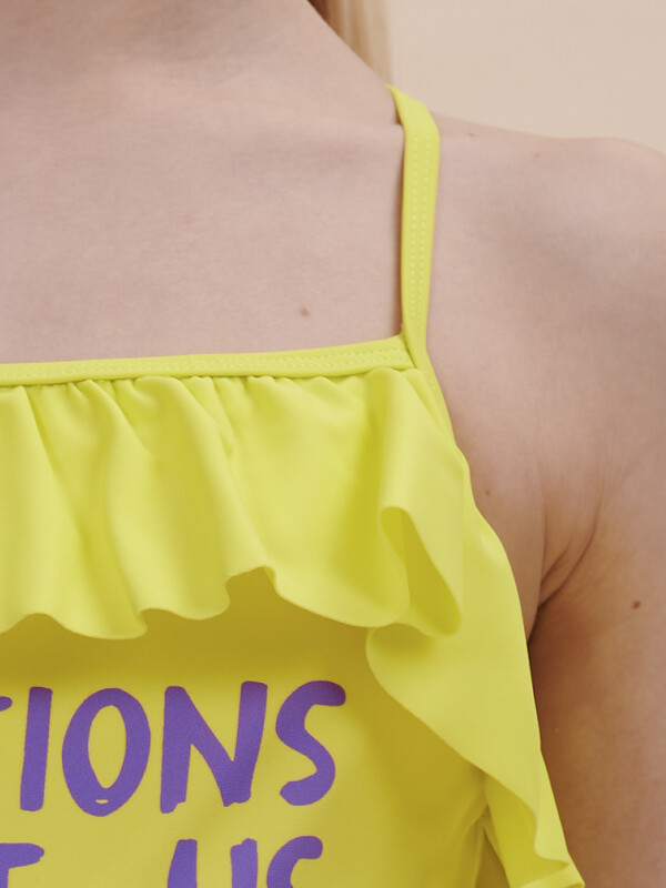 Яркий и модный слитный купальник для девочки. Модель с горизонтальным вырезом горловины подходит для девочек с любым типом фигуры. Тонкие и мягкие бретели не сползают, исключают трение и раздражение. На спинке бретели перекрещиваются, предусмотрена возможность регулировки длины. Детский купальник выполнен из полиамида и эластана — он прекрасно тянется, не теряя при этом своей формы, не выгорает и быстро сохнет. По верхней линии изделие украшено декоративным рюшем. По переду модель декорирована ярким позитивным принтом с пайетками в виде большого разноцветного мороженого, надпись переводится:"эмоции делают нас людьми". Принт эластичный и стойкий, отлично переносит многочисленные стирки. Модель представлена в двух трендовых неоновых цветах: розовый и зелёный. В линейке есть детские купальники следующих размеров: 3 (98); 4-5 (104-110); 6-7 (116-122); 8-9 (128-134); 10-11 (140-146). Купальник красивый подходит для девочек дошкольного, младшего школьного возраста и девочек-подростков. Отличный вариант для летнего отдыха, пляжа, моря и бассейна. Модный купальник — чудесный подарок дочери, внучке или сестре на любой праздник. Выбирайте нужный размер по таблице размеров на фото. Цвет товара на экране вашего устройства может отличаться от цвета изделия вживую. Товар возврату и обмену не подлежит.