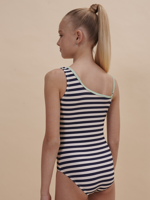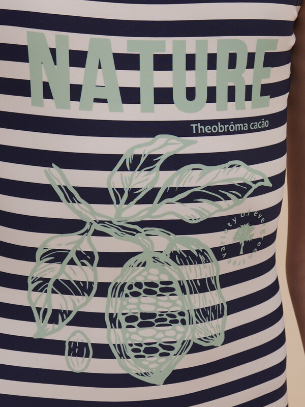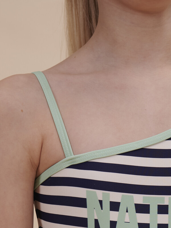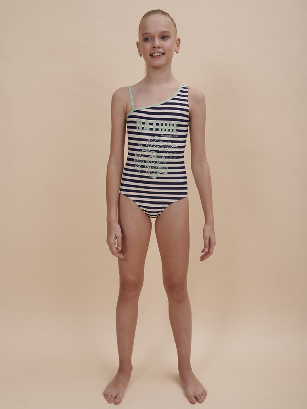 Модный слитный купальник для девочки. Модель с оригинальными ассиметричными лямками, они не сползают, исключают трение и раздражение. На узкой бретели сзади предусмотрена регулировка длины. Передняя часть изделия с подкладкой — не просвечивает. Детский купальник выполнен из полиамида и эластана — он прекрасно тянется, не теряя при этом своей формы, не выгорает и быстро сохнет. По переду модель декорирована красивым принтом в ботаническом стиле. На принте изображены какао-бобы. Надпись переводится:"природа". Принт мягкий и стойкий, не боится частых стирок. Купальник в тёмно-синюю горизонтальную полоску — такой узор в стиле тельняшки — один из самых трендовых в этом сезоне. В линейке есть детские купальники следующих размеров: 3 (98); 4-5 (104-110); 6-7 (116-122); 8-9 (128-134); 10-11 (140-146). Купальник красивый подходит для девочек дошкольного, младшего школьного возраста и девочек-подростков. Отличный вариант для летнего отдыха, пляжа, моря и бассейна. Модный купальник — чудесный подарок дочери, внучке или сестре на любой праздник. Выбирайте нужный размер по таблице размеров на фото. Цвет товара на экране вашего устройства может отличаться от цвета изделия вживую. Товар возврату и обмену не подлежит.