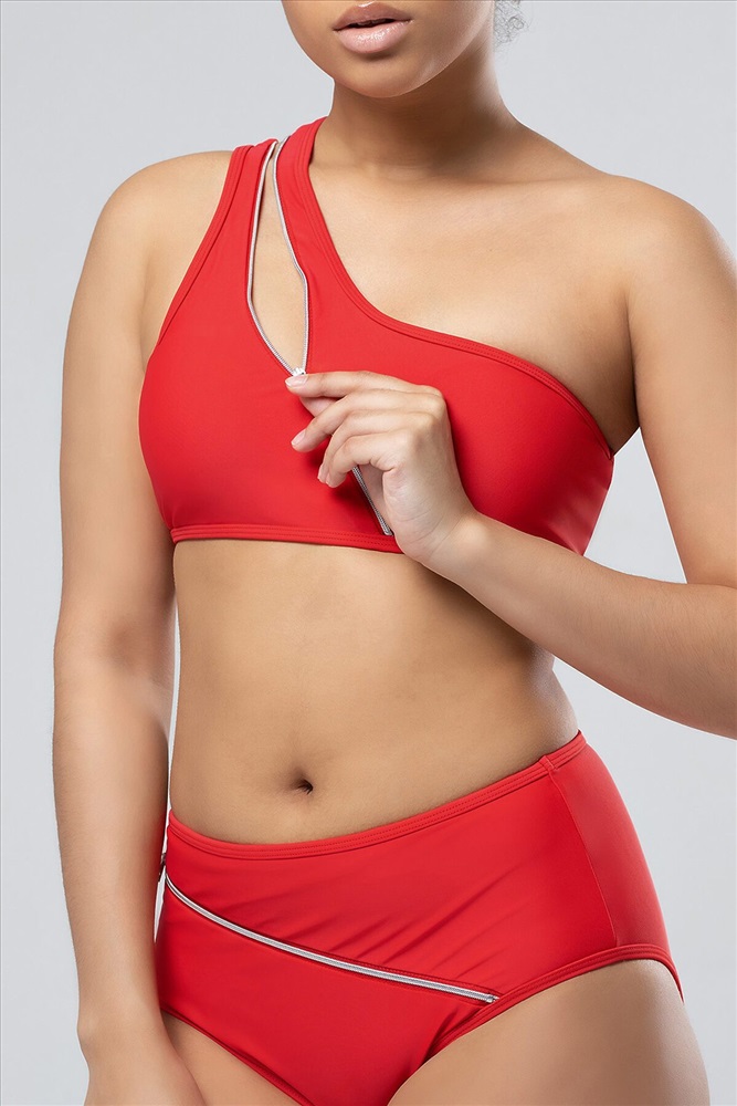 Женский купальник бикини: лиф и трусики. Оригинальный авангардный дизайн не оставит вас незамеченной на пляже или в бассейне. Серебряные молнии расстегиваются на желаемую длину и позволяют создавать различные вариации форм и очертаний купальника. Лиф ассиметричный, на правое плечо, со встроенными съемными формованными чашечками. Трусики с высокой талией, с подкладкой по всему объему, уверенно фиксируются на бедрах и подтягивают животик.