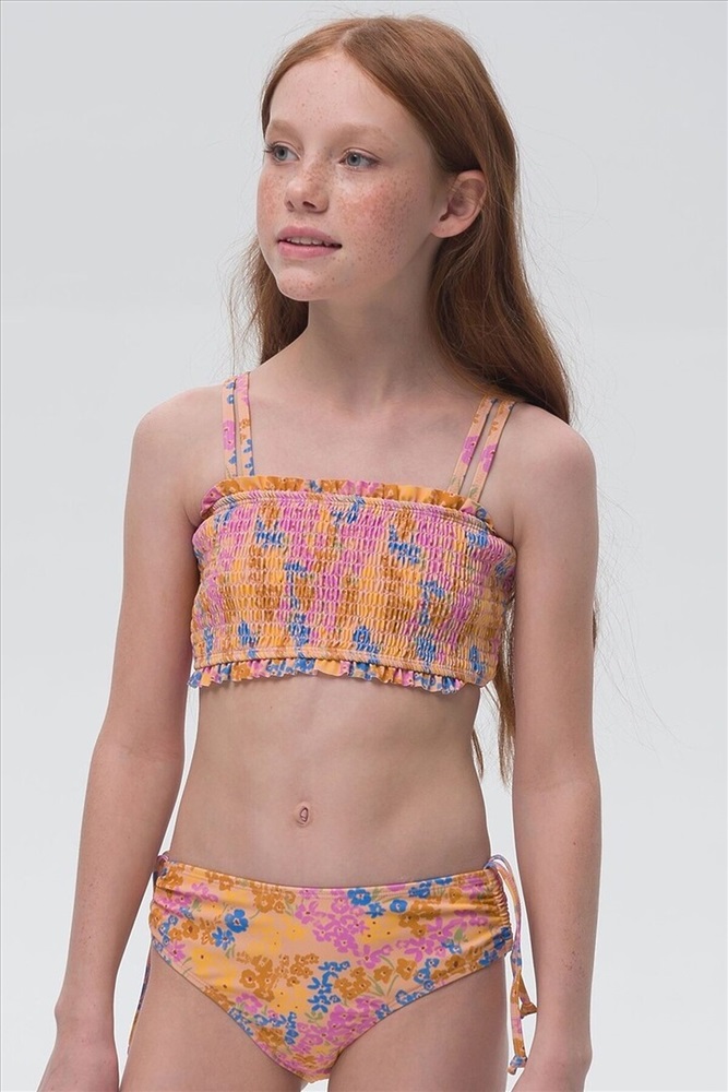Модный раздельный купальник для девочек. Яркий купальник с принтом для юной русалочки и законодательницы моды пляжа и моря. Верх - топ собранный эластичными строчками. По верхнему и нижнему краю топа аккуратная рюша. Двойные лямки тонкие из основной ткани на регулировке. Низ - трусы с утяжками по бокам ни шнурки из основной ткани. Купальник для девочки с принтом в цветочек создан из качественной, специализированной ткани, хорошо пропускает воздух, плотно прилегает к телу ребенка и не соскальзывает во время купания. Костюм для плавания не становится тяжелый при намокании и очень быстро сохнет. Благодаря эластичности полотна, купальник детский комфортно сядет по фигуре, его легко надевать и снимать. Стильный и практичный купальник для пляжа и для бассейна, подойдет для водных видов спорта, на пляж, для отдыха. Красивый купальник подойдет для малыша, для детей и подростка, которые любят загорать на пляже и купаться в воде. Защитит от солнца и подарит максимум комфорта и свободы движений.
