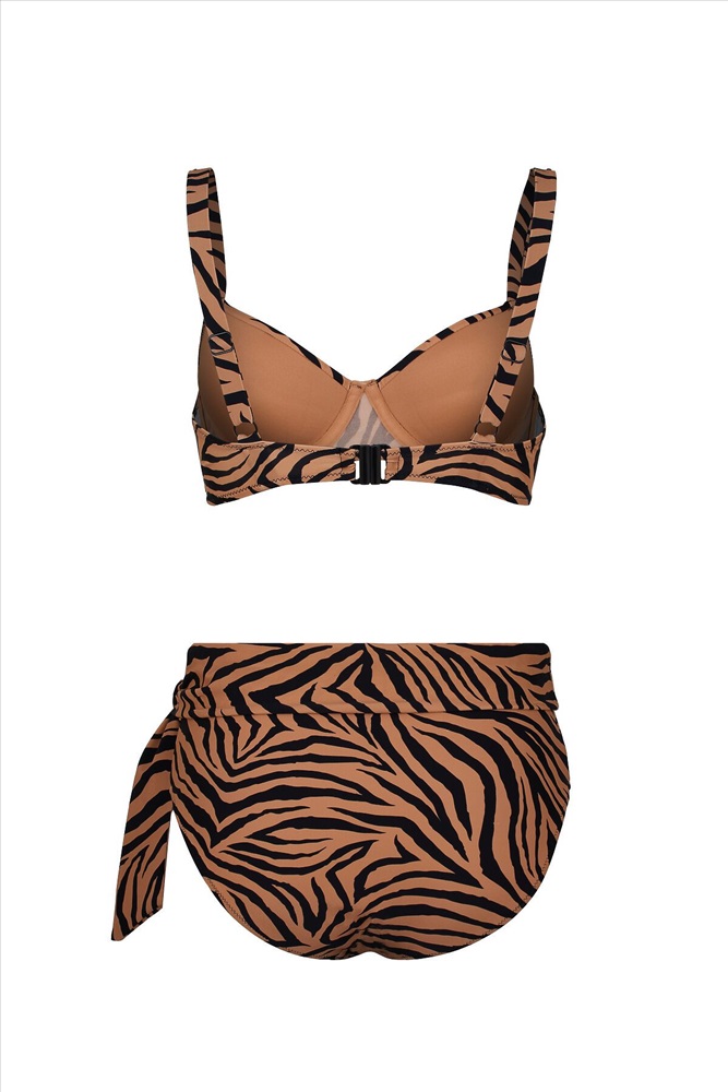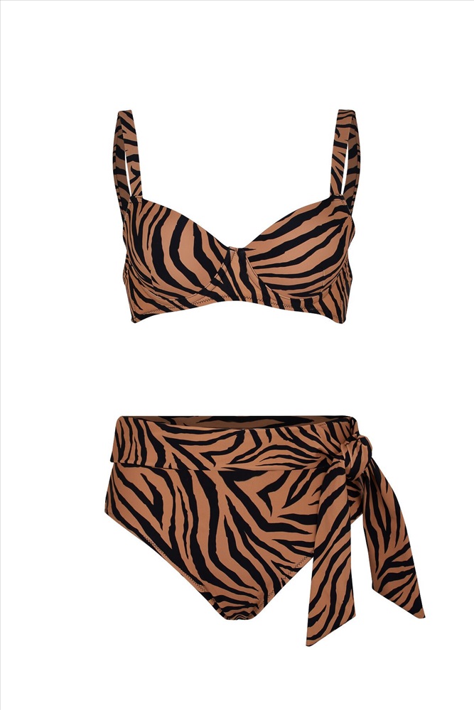 Страна производства: Россия Раздельный купальник с формованной чашкой balconette, с push-up во всех размерах, на каркасах и с боковыми корсетными вставками. Выполнен из мякого полотна с анималистичным принтом. Бюстгалтер с пластиковой застежкой. Широкие бретели, регулируемые,несъемные. Плавки на подкладе, с завышенной линией талии. Декоративный пояс завязывается сбоку на бант. Тонкая резинка и подгиб,плоский шов по линии талии и срезу ног
