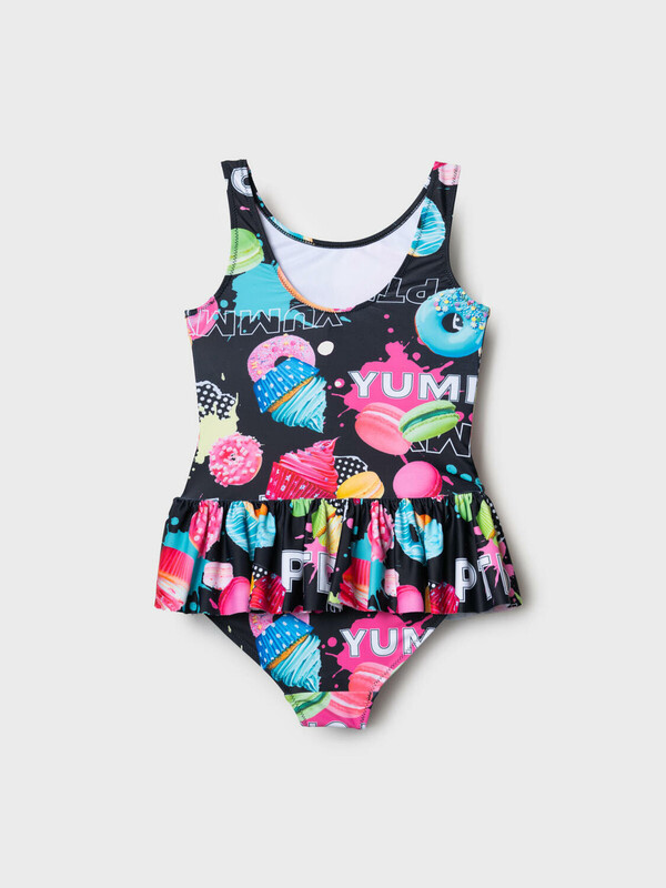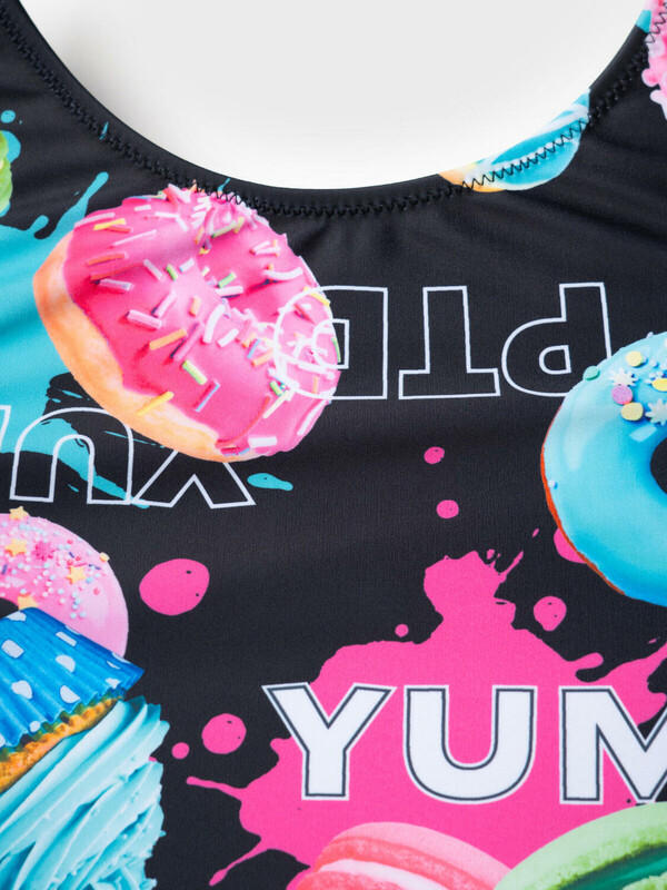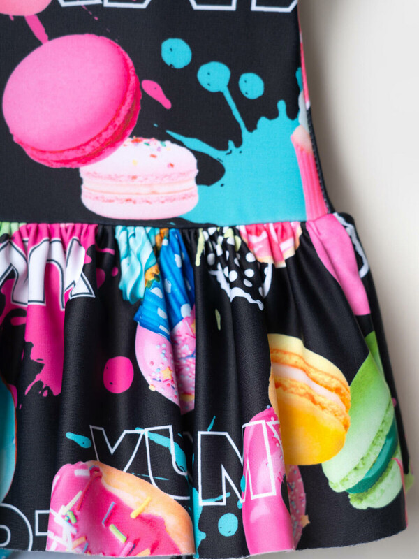 Слитный купальник для девочки подростка. Модель с удобными широкими бретелями, круглым вырезом спереди и глубоким U-образным на спине. Внизу пришита юбочка. Основной материал – эластичный трикотаж с насыщенным цветным принтом: пончики, капкейки, макаруны на черном фоне, дополненные яркими надписями. Внутри есть подкладка и гигиеническая вставка. По краям купальник обработан мягкой резинкой для комфортной посадки. Благодаря UF-защите, ткань сохраняет первоначальный вид даже при длительном пребывании на солнце. Подходит для плавания и активного отдыха.