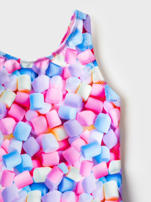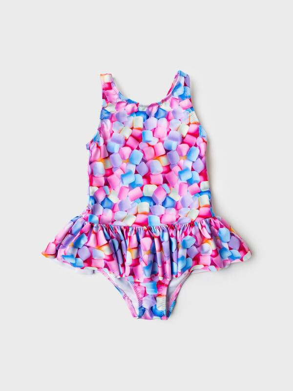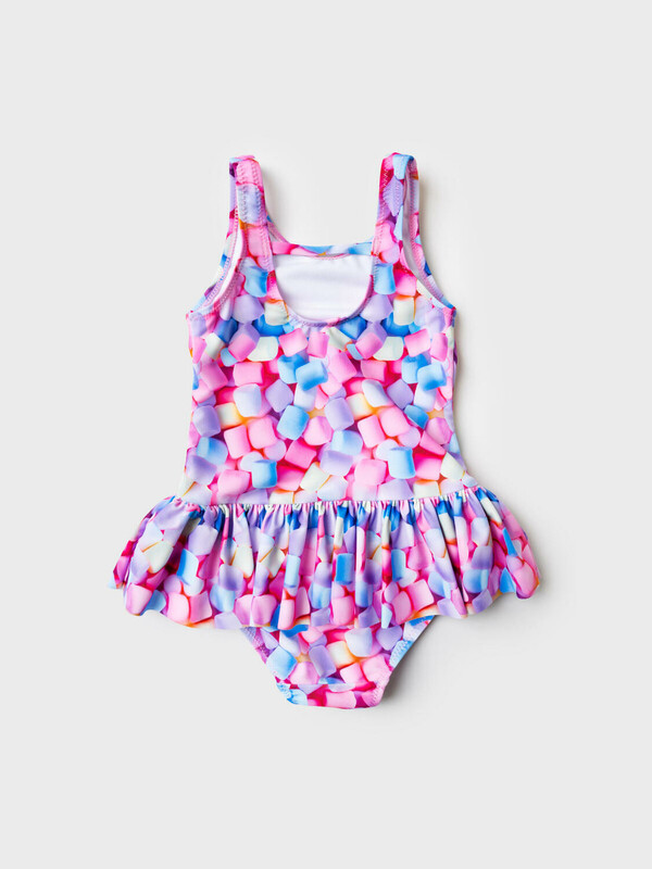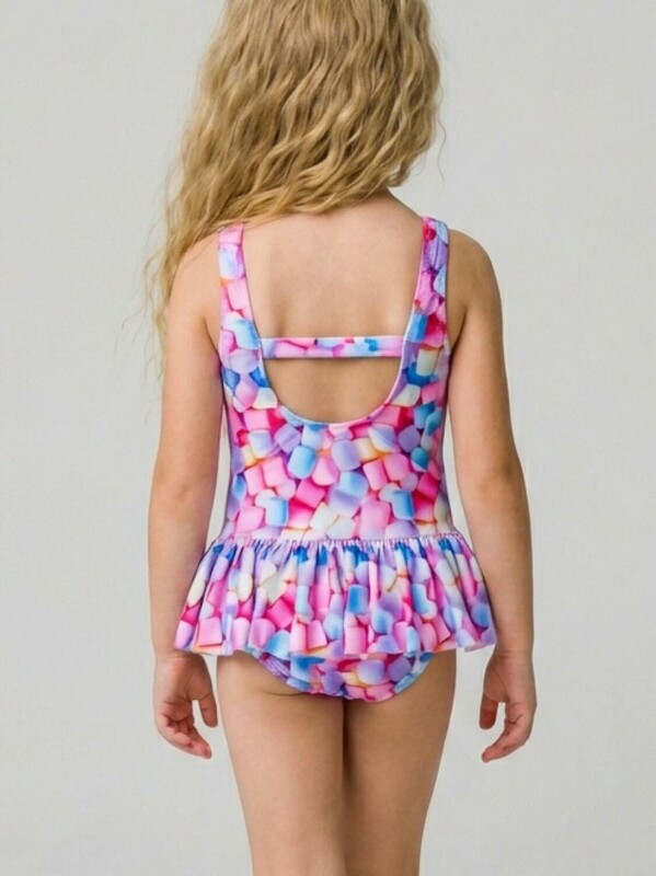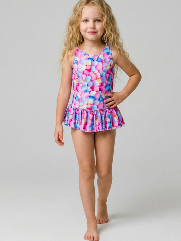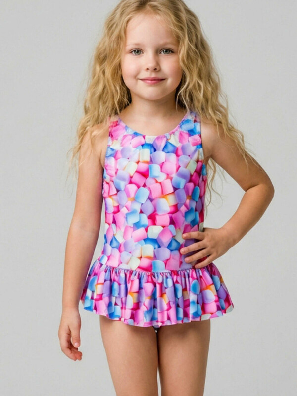 Слитный детский купальник для девочки. Ткань с ярким принтом зефира в пастельных оттенках: розовый, голубой, сиреневый и кремовый. Модель выполнена на широких бретелях. По линии талии пришита легкая оборка, создающая эффект юбочки. На спинке — глубокий вырез и эластичная резинка. Все края обработаны эластичной тесьмой, чтобы изделие хорошо сидело на теле и не натирало. Благодаря UF-защите, ткань сохраняет первоначальный вид даже при длительном пребывании на солнце. Подходит для плавания и активного отдыха.