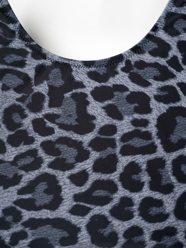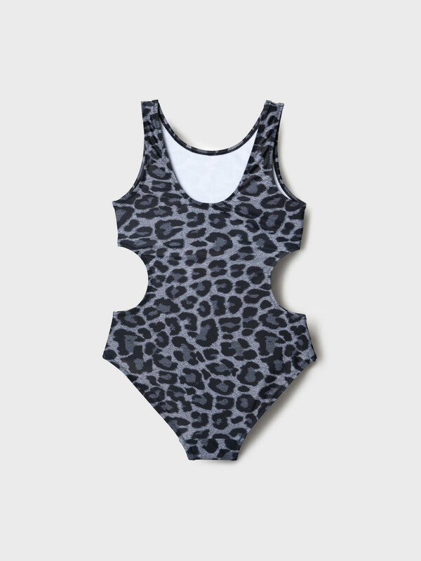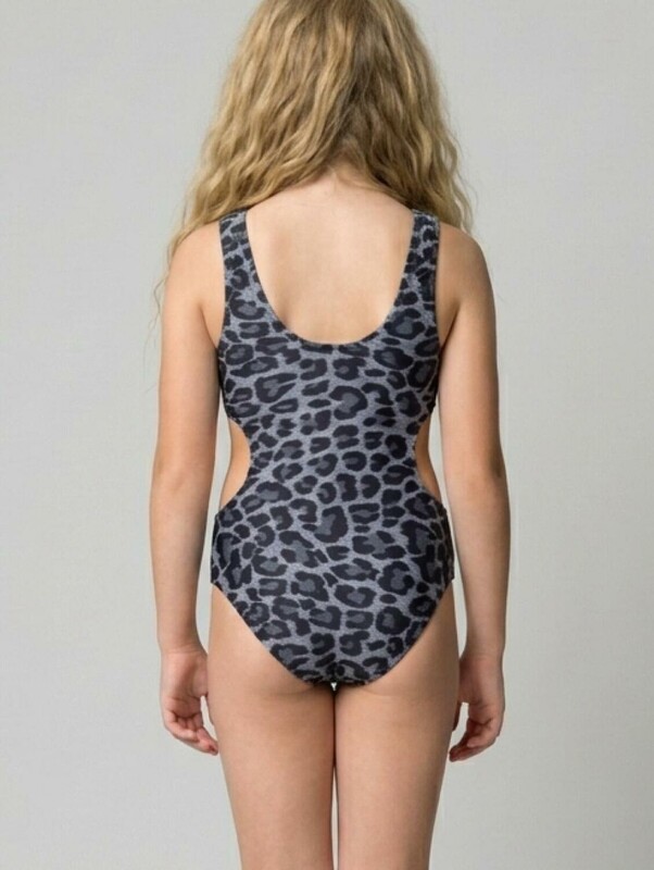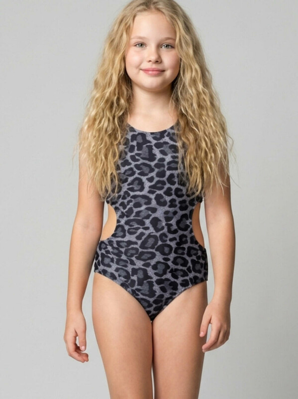 Слитный купальник для девочки подростка. Необычный дизайн с глубокими вырезами по бокам и открытой спиной. Он выполнен из эластичного материала с эффектным леопардовым принтом в серо-черной гамме. Внутри на подкладке — в зоне переда и ластовицы. Съемные чаши. Все края обработаны эластичной лентой для комфортной посадки. Купальник удобен и эффектен, отлично подойдет для отдыха и плавания.