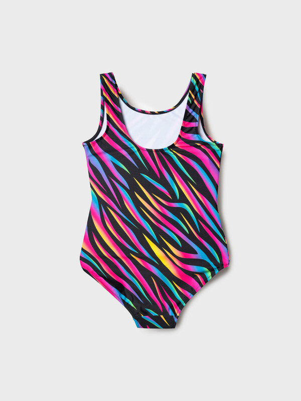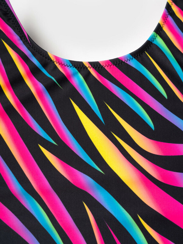 Слитный купальник для девочки подростка. Модель выполнена из эластичного трикотажного материала и оформлена ярким принтом в стиле "зебра" с плавными переходами между неоновыми цветами — розовым, жёлтым, зелёным, синим и фиолетовым. Купальник плотно облегает фигуру, с классической круглой горловиной и широкими бретелями. Внутри есть мягкие съемные чашки и подкладка. Эластичные резинки обеспечивают комфортную посадку и поддерживают форму. Благодаря UF-защите, ткань сохраняет первоначальный вид даже при длительном пребывании на солнце. Идеально подойдёт для плавания и отдыха у воды.
