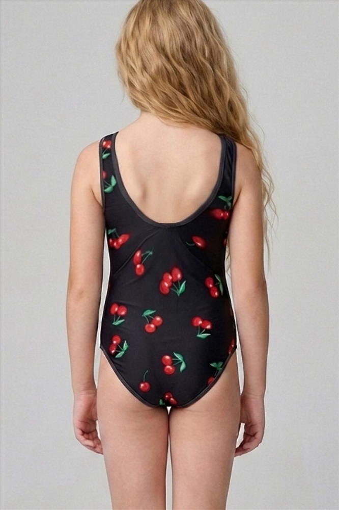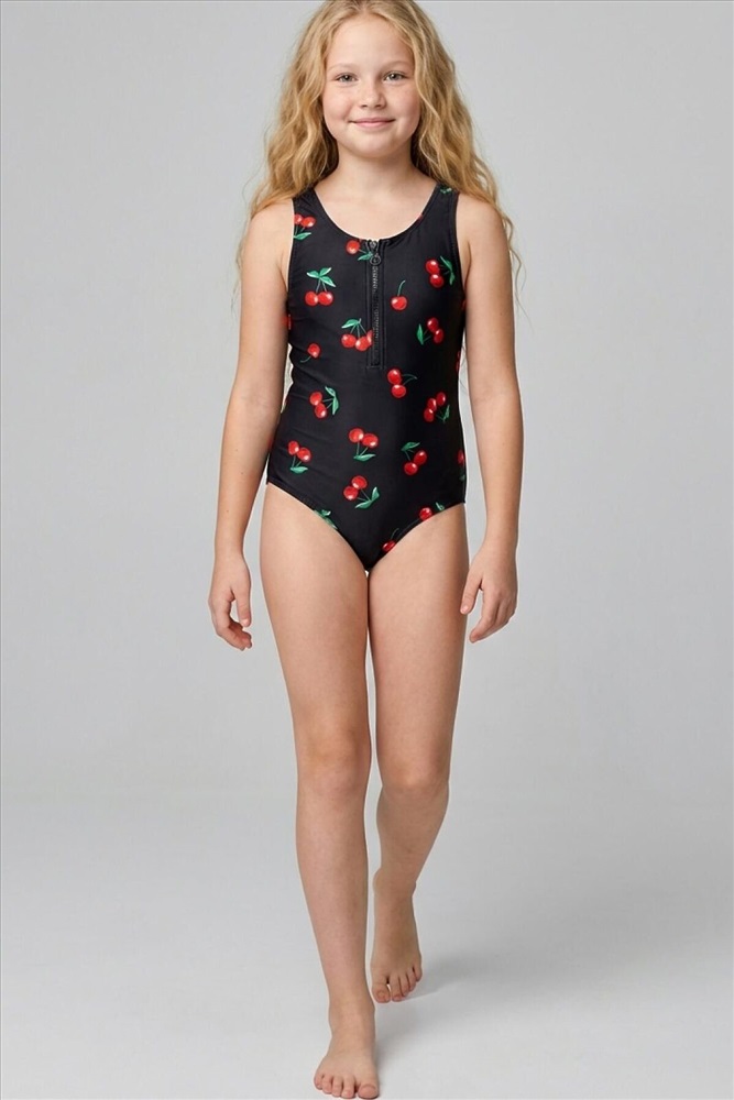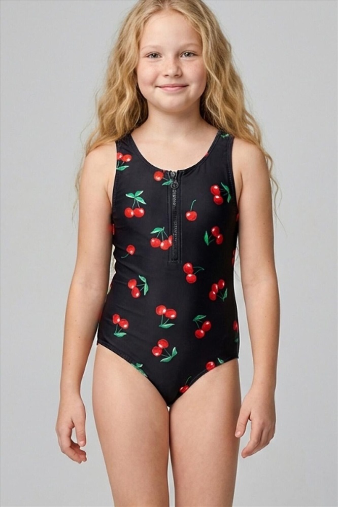 Слитный купальник для девочки подростка. Выполнен из эластичного черного материала с ярким принтом в виде вишен. Спереди расположена короткая молния, облегчающая надевание. Все края обработаны эластичной тесьмой, чтобы изделие хорошо сидело на теле и не натирало. Внутри передняя часть продублирована подкладкой, а для старших размеров с 140 по 170 предусмотрены съемные чашечки. лагодаря UF-защите, ткань сохраняет первоначальный вид даже при длительном пребывании на солнце. Купальник отлично садится по фигуре и подходит для активного отдыха и плавания.