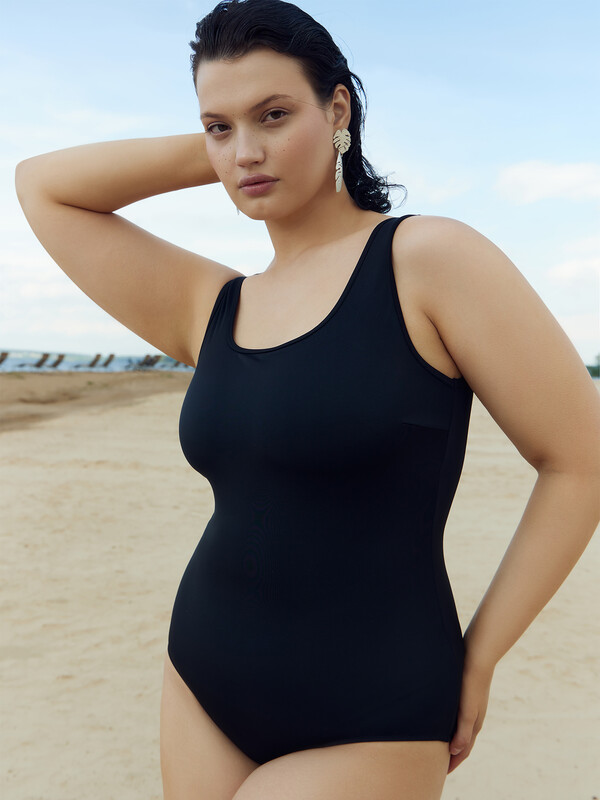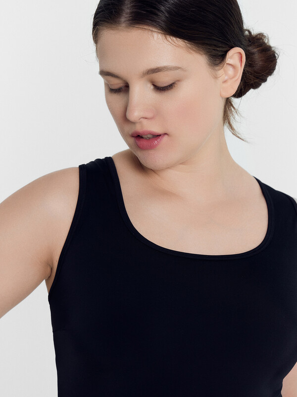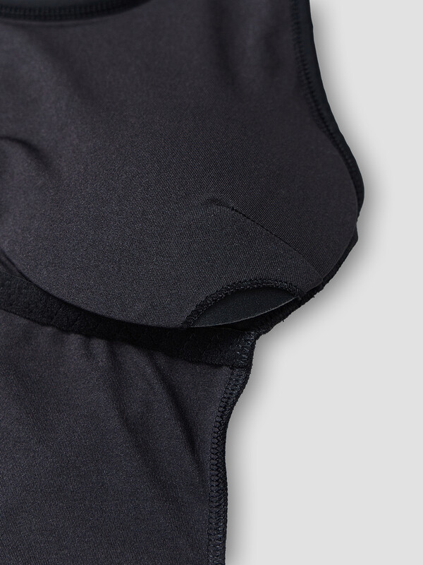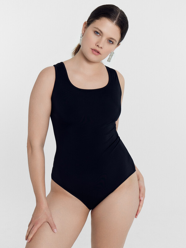 Перед цельный на подкладке, с вытачками на грудь от боковых срезов. На подкладке стоит эластичная тесьма под грудью, обработаны кармашки для чашек-вкладышей. По переду не глубокий вырез горловины. Узкое плечо. Срез горловины и проймы окантованы узкой бейкой из основного полотна с эластичной резиновой тесьмой внутри. По спинке вырез горловины до уровня лопаток. Закрытая линия бедра. Ножки обработаны швом вподгибку на плоскошовной машине с эластичной резиновой тесьмой внутри. верх: 80% полиамид, 20% эластан; подкладка: 82% полиамид, 18% эластан Комментарии к товару