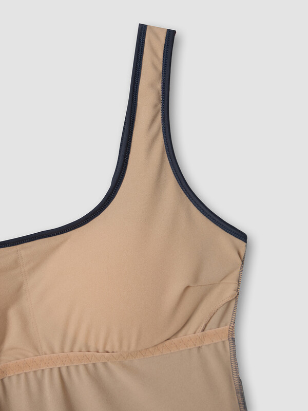 Перед цельный на подкладке, с вытачками на грудь от боковых срезов. На подкладке стоит эластичная тесьма под грудью, обработаны кармашки для чашек-вкладышей.