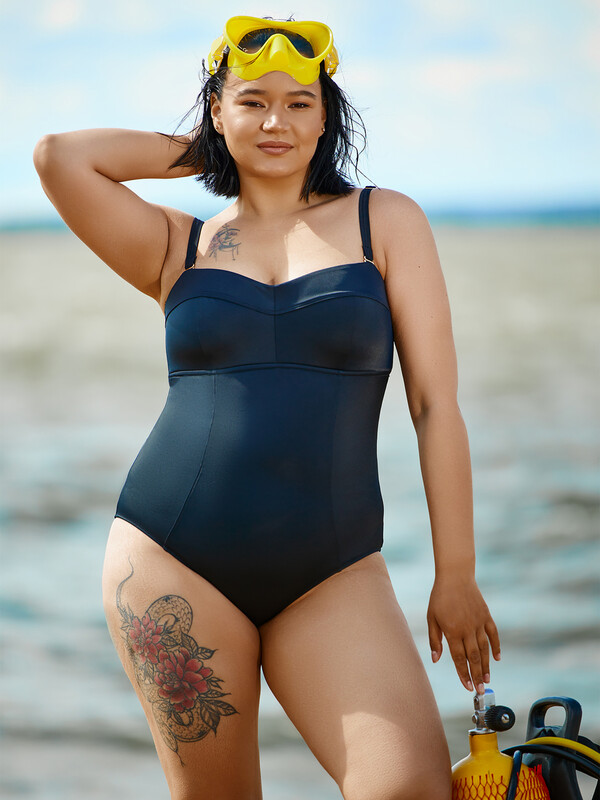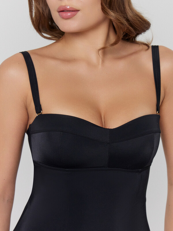 Купальник женский слитный со съемными бретелями. Перед на подкладке, с вертикальными рельефами, и горизонтальным подрезом под грудью. Чашки с декоративным горизонтальным членением. Чашки на подкладке из дубляжа. В бочках на ровне дубляжа настрочена каркасная тесьма с пластинами. По нижнему срезу дубляжа с изнаночной стороны настрочена эл тесьма 10 мм (жесткая без/зуба, девсел 487W).