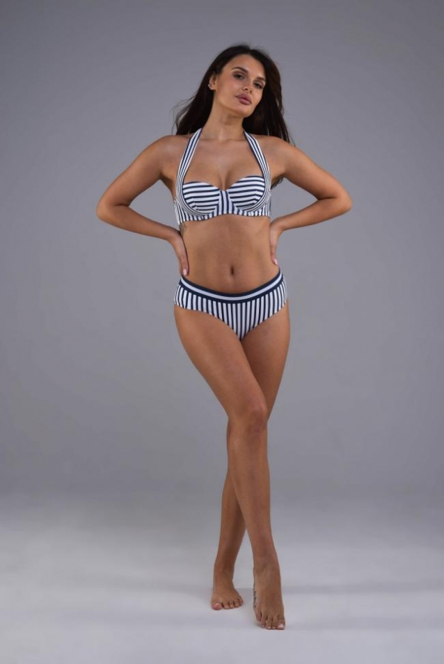 Купальный комплект женский состоит из бюстгальтера с формованной чашкой bandeau без push-up во всех размерах и классических плавок. Купальник женский раздельный, открытый, для загара, для бассейна из принтованного эластичного полотна, которое не выцветает на солнце и быстро сохнет. Купальник стильный, модный, яркий, трендовый. Купальный комплект состоит из бюстгальтера с формованной чашкой, классического кроя со скрытыми каркасами, на косточках без эффекта пуш-ап, обеспечивает хорошую поддержку груди, подчеркивая ее естественную красивую форму. Купальник с принтом в морском стиле в разнонаправленную полоску синего цвета на белом фоне выполнен на мягком рифленом эластичном полотне. Интересное дизайнерское решение крепления бретели через шею, с отлетной деталью, вшитой в каркас чашки. В комплект входят плавки с широким бочком, по талии широкая жаккардовая резинка в поддержку стилистики принта. Передняя и задняя детали плавок с подкладкой в основной цвет ткани. Не отбеливать; Не использовать химчистку; Не гладить; Не использовать машинную сушку; Стирать с изделиями схожих цветов; Ручная стирка