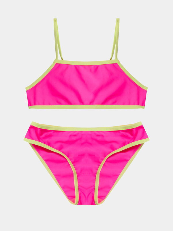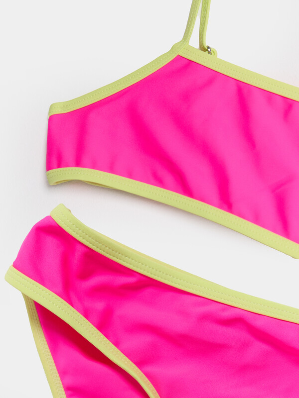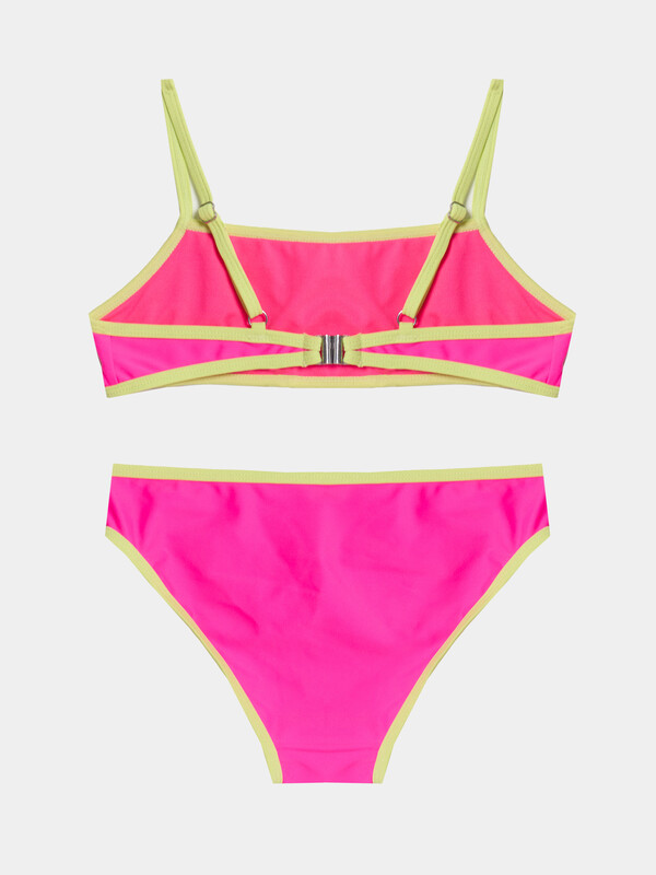 Трикотажное эластичное полотно. Трикотажное полотно, подкладка для купальников. Передняя и задняя детали топа, передняя и задняя детали трусов цельнокроенные. Подкладка передней детали топа и подкладка ластовицы, передней детали трусов из трикотажного полотна. Верхние и нижние срезы трусов и топа обработаны бейкой из основного полотна. По спинке топа застежка. Бретели из основного полотна с надставками, регулируются по длине сзади.