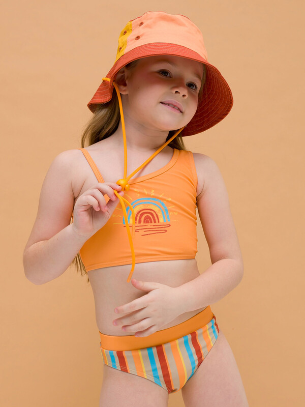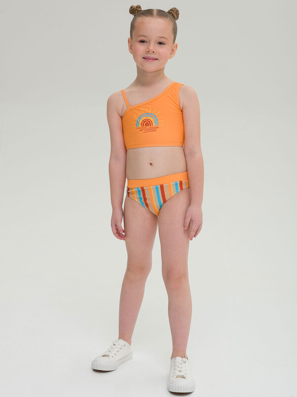 Раздельный купальник для девочки. Удлиненный топ с ассиметричными лямками можно носить с юбкой и шортами. Передняя часть на подкладе - не просвечивает. Трусики с высокой посадкой на подкладе спереди. Широкий контрастный пояс на внутренней резинке - не передавливает, не закатывается. Ткань эластичная, не линяет и не выгорает на солнце.