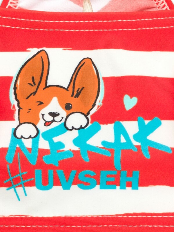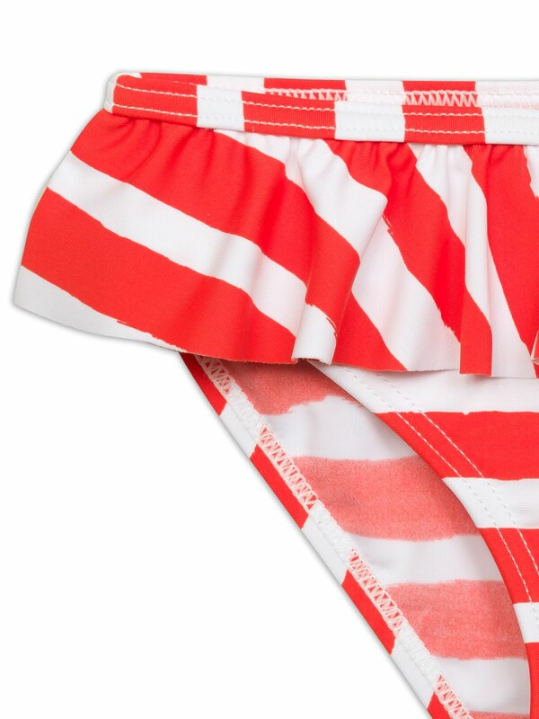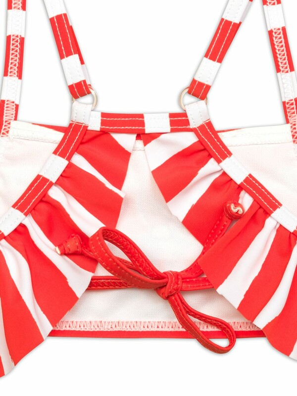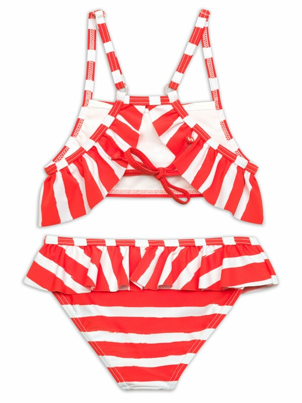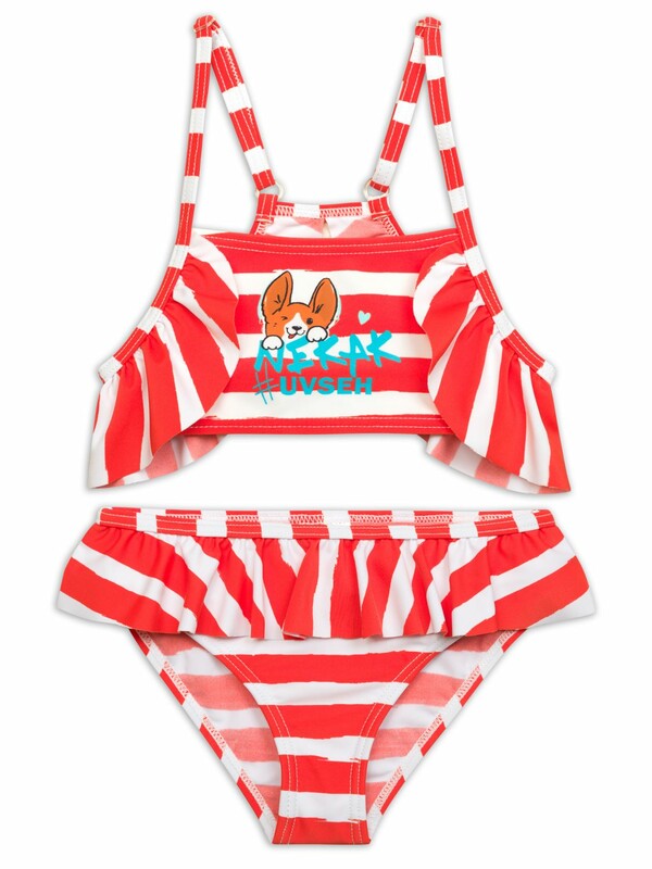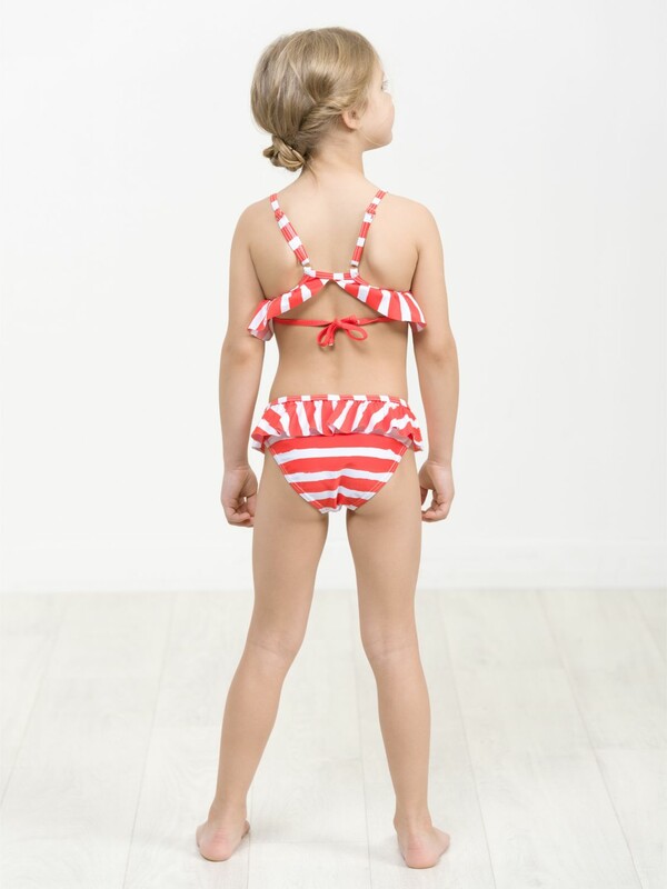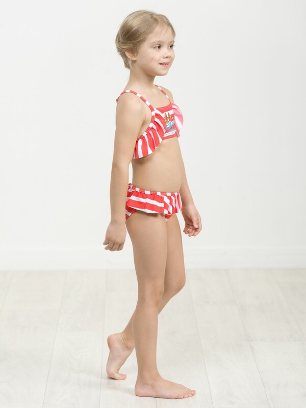 Раздельный купальник для девочек. Верх топ с декоративной рюшей по проймам, лямки с регулировкой по длине. На подкладе. Регулировка по ширине завязками на спинке. Низ трусы с увеличенной высотой посадки. Рюша по верхнему краю, перед на подкладе.