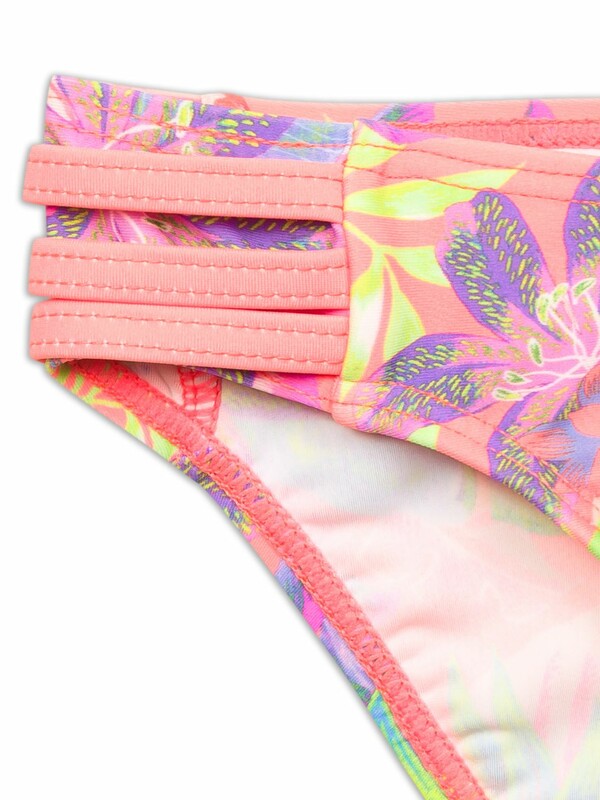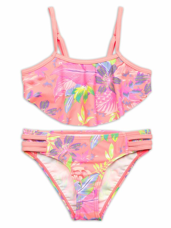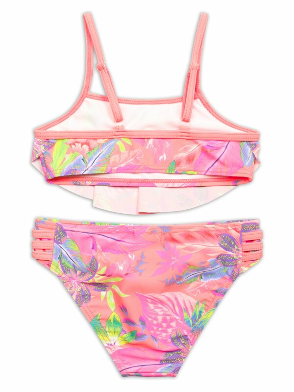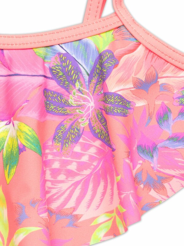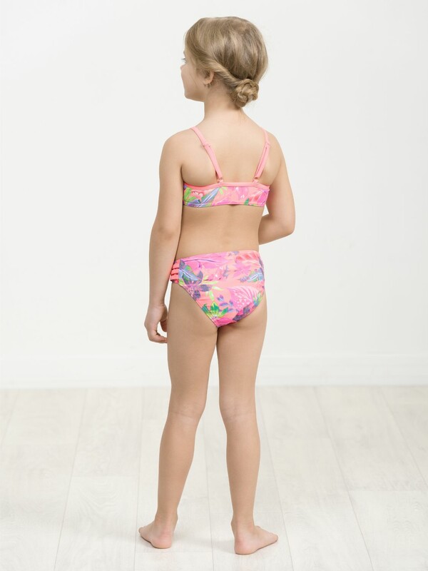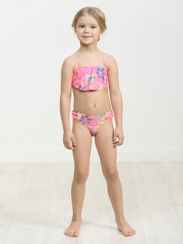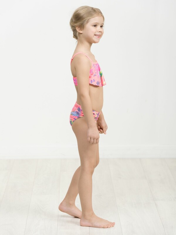 Раздельный купальник для девочек. Верх симметричный топ без регулировки объема, по переду большой волан. Лямки с регулировкой по длине. Перед продублирован подкладкой. Низ трусы с увеличенной высотой посадки. Декор боковые вставки с тремя параллельными полосками. Перед продублирован подкладкой.