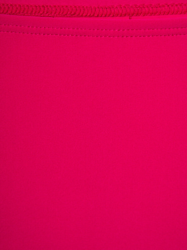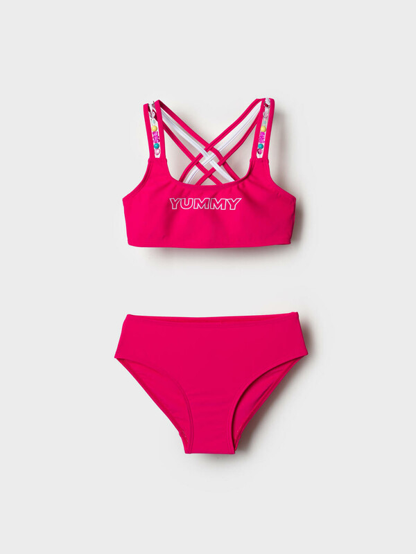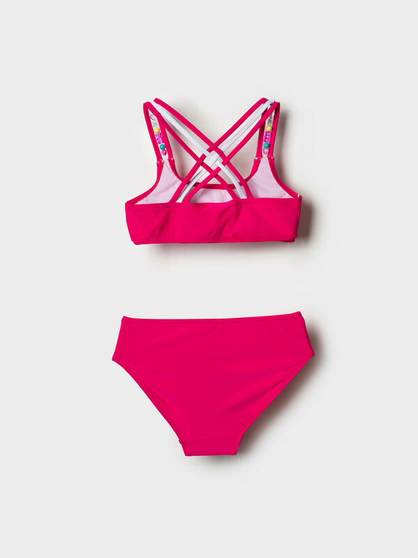 Раздельный купальник для девочки подростка. Он состоит из короткого топа и классических плавок. Купальник выполнен в ярко-розовом цвете и украшен контрастными перекрещенными лямками — розовыми, белыми и черными. На лямках — декоративные бусины в форме сердечек и шариков, что делает дизайн веселым и привлекательным. Спереди на топе размещён принт. Внутри — подкладка и силиконовая лента для лучшей фиксации. Благодаря UF-защите, ткань сохраняет первоначальный вид даже при длительном пребывании на солнце. Подходит для плавания и активного отдыха.