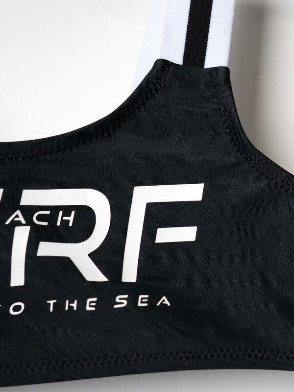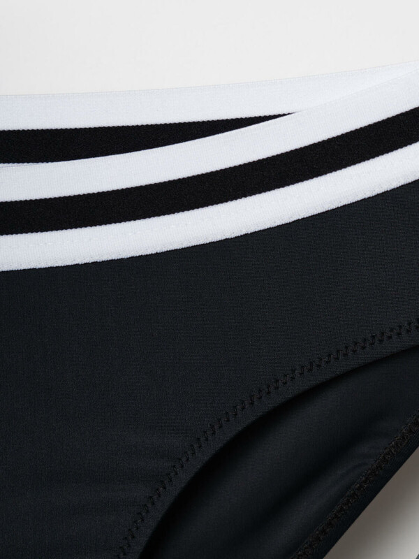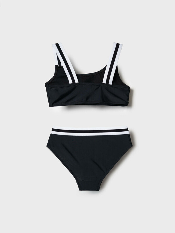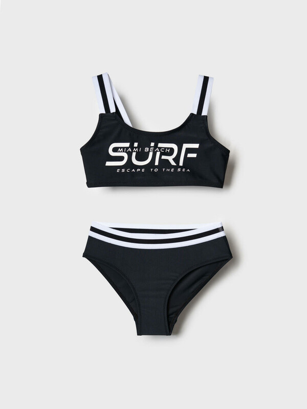 Купальник раздельный для девочки подростка. Благодаря UF-защите, ткань сохраняет первоначальный вид даже при длительном пребывании на солнце. На топе расположен яркий принт. Бретели широкие, двойные, бело-черные, перекликаются с декоративной тесьмой на поясе плавок. Внутри топа — мягкие чашки и подкладка, плавки также снабжены подкладкой и гигиенической вставкой. Все края обработаны мягкими эластичными лентами для комфорта. Яркий, стильный и удобный купальник, идеально подходит для активного отдыха и плавания.