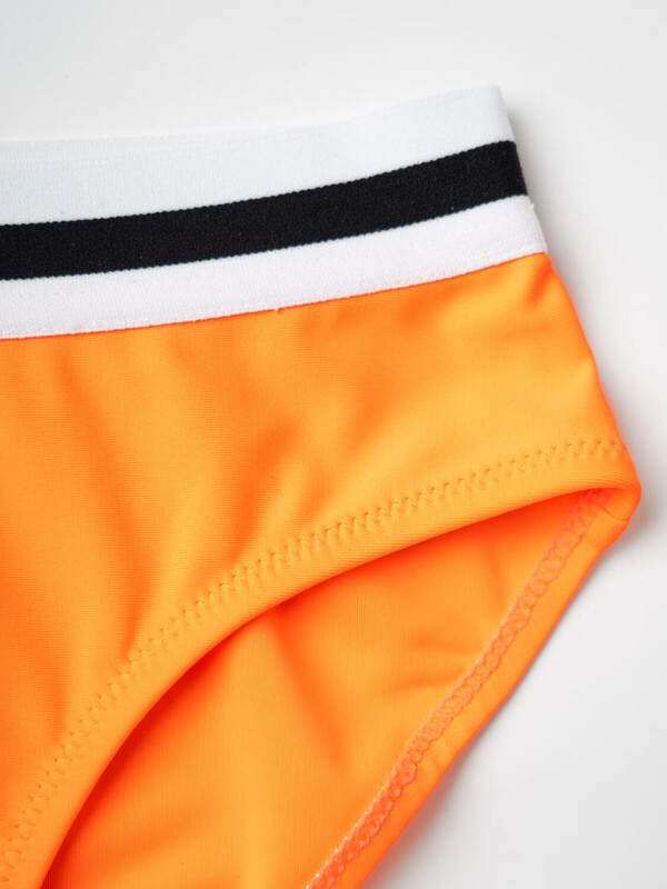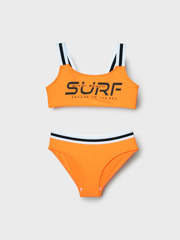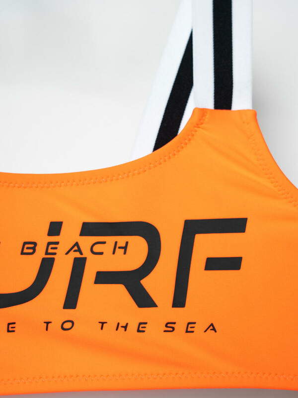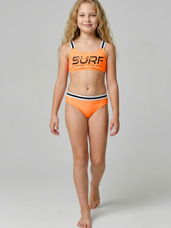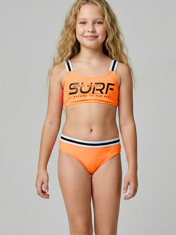 Купальник раздельный для девочки подростка. Топ с удобными широкими бретелями и мягкой подкладкой спереди, украшен крупным надписью. Плавки классической формы с подкладкой. Особое внимание привлекает декоративная черно-белая тесьма на бретелях и по линии талии. Все края обработаны эластичной тесьмой, чтобы изделие хорошо сидело на теле и не натирало. Благодаря UF-защите, ткань сохраняет первоначальный вид даже при длительном пребывании на солнце. Изделие выполнено из эластичного трикотажа и предназначено для активного отдыха у воды.