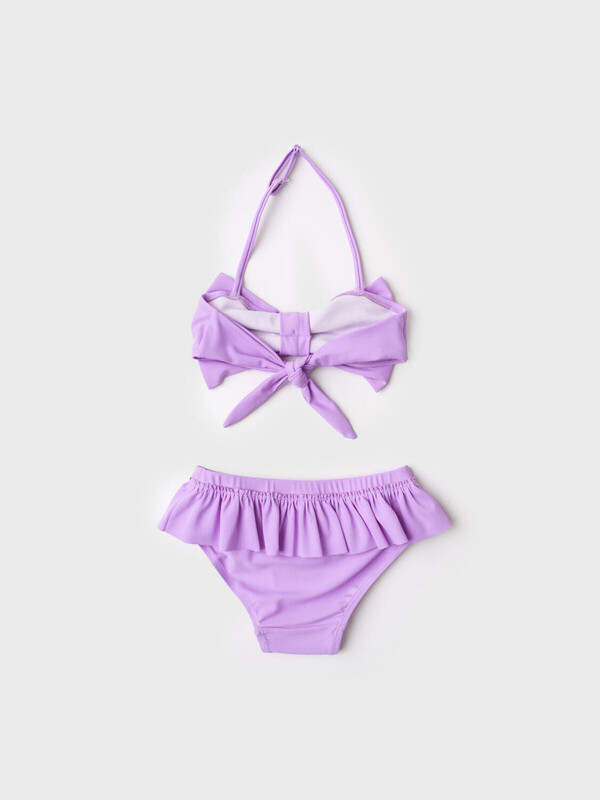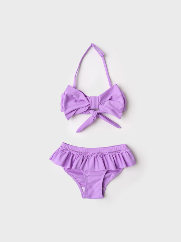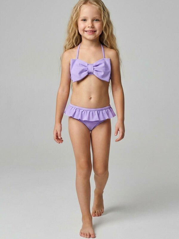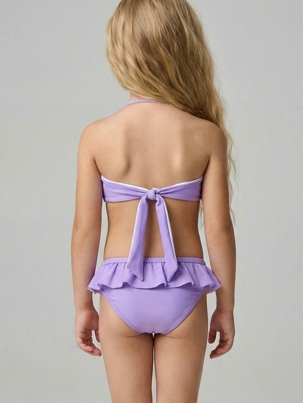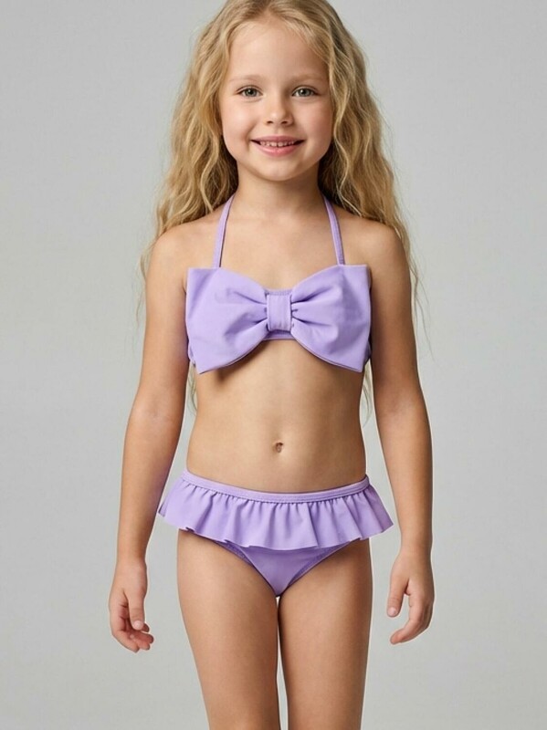 Раздельный детский купальник для девочки. Верх выполнен в виде лифа с крупным бантом и завязкой сзади. Регулируемые бретели крепятся с помощью прозрачных пластиковых деталей. Низ — классические плавки на подкладке с присборенным воланом по талии. Основной цвет — светло-сиреневый. Все края обработаны эластичной тесьмой, чтобы изделие хорошо сидело на теле и не натирало. Благодаря UF-защите, ткань сохраняет первоначальный вид даже при длительном пребывании на солнце. Подходит для плавания и активного отдыха.
