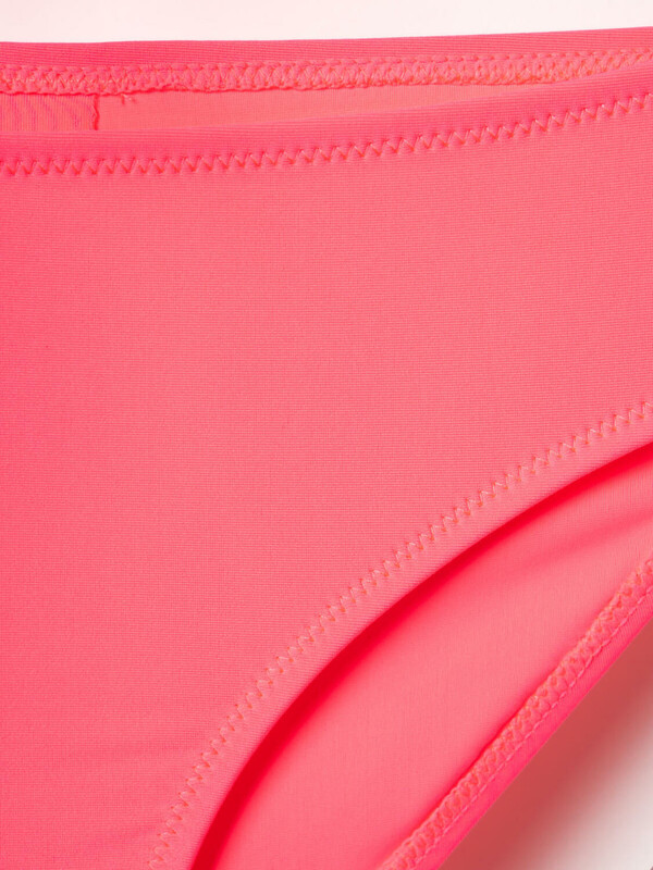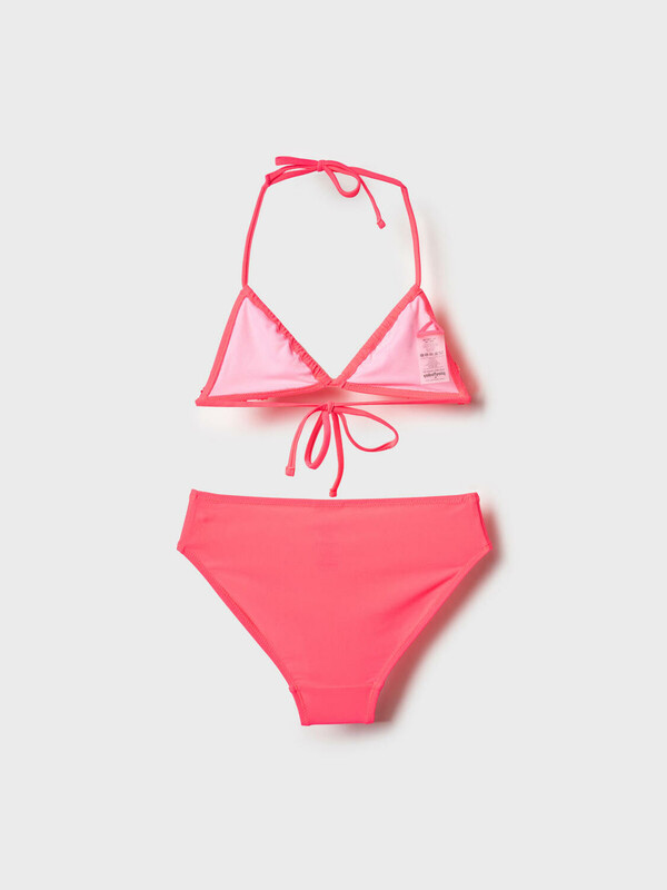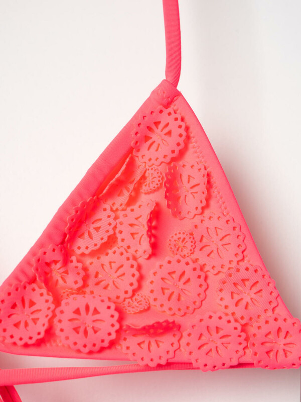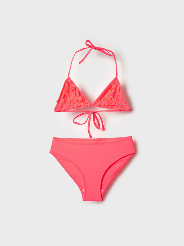 Раздельный купальник для девочки подростка. Верх состоит из треугольных чашечек, которые завязываются на шее и фиксируются на спине. Впереди чашечки украшены чёрным кружевом с объёмной текстурой, что делает изделие особенно выразительным. Низ — классические чёрные плавки с подкладкой, комфортной для носки. Все края обработаны эластичной тесьмой, чтобы изделие хорошо сидело на теле и не натирало. Благодаря UF-защите, ткань сохраняет первоначальный вид даже при длительном пребывании на солнце. Подходит для плавания и активного отдыха.