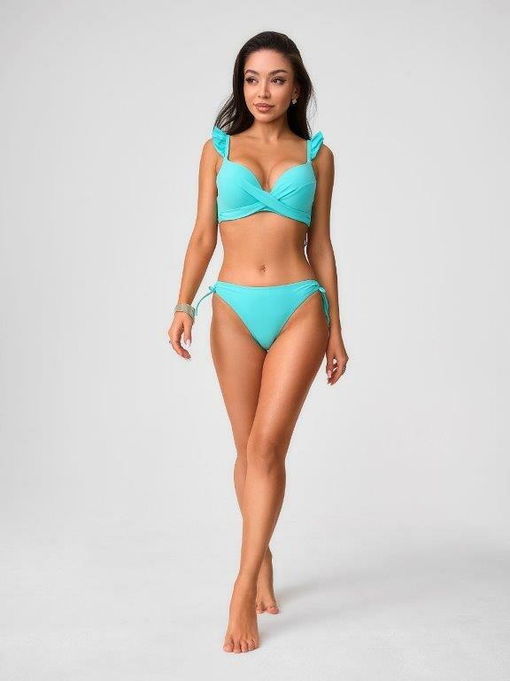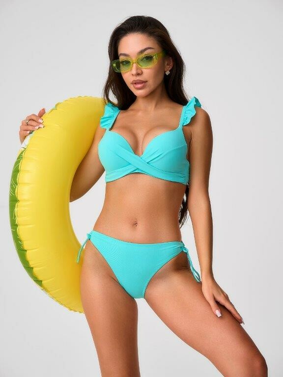 Раздельный купальник из эластичного полотна с чашкой padded triangle . Бюстгальтер на формованной чашке с push-up во всех размерах. На каркасах , с боковыми корсетными вставками. Спереди декоративное переплетение из ткани купальника.Бретели регулируемые, не съемные, с декоративными рюшами из ткани купальника. Пластиковая застежка. Плавки на подкладе с завышенной талией. По бокам регулируемые завязки из ткани купальника. Тонкая резинка, подгиб и плоский шов по линии талии и срезу ножек.