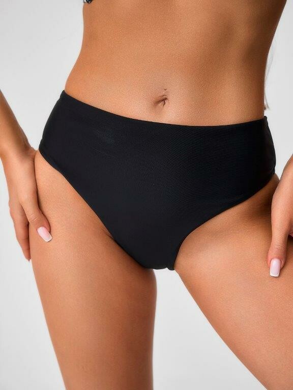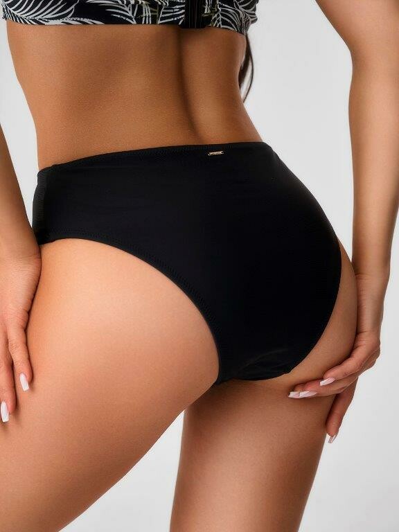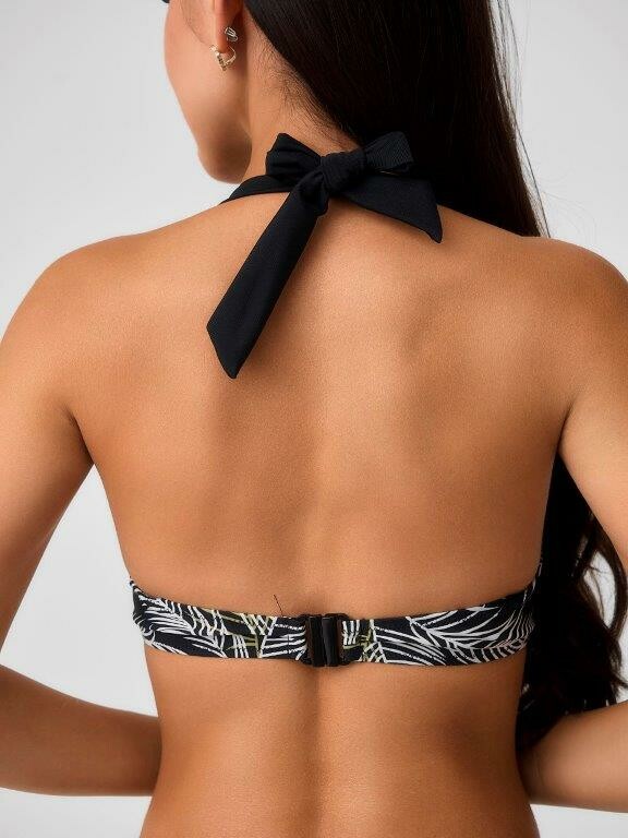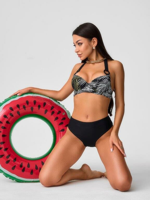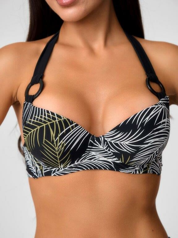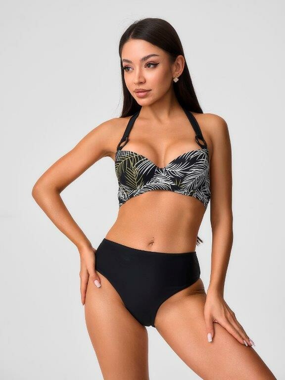Раздельный купальник из принтованного эластичного полотна в пальмовые ветки белого и желто-зеленого цвета состоит из бюстгальтера и плавок. Бюстгальтер с формованной чашкой Balconette bra с неольшим мягким push up во всех размерах, на каркасах и с боковыми корсетными вставками. Бретель крепится к чашках большими пластиковыми кольцами и завязывается на шее. На спинке пластиковая застежка. Однотонные плавки черного цвета на подкладе, с высокой посадкой и фразцузским вырезом ножек. По линии талии и срезу ножек подгиб и плоский шов с резинкой.