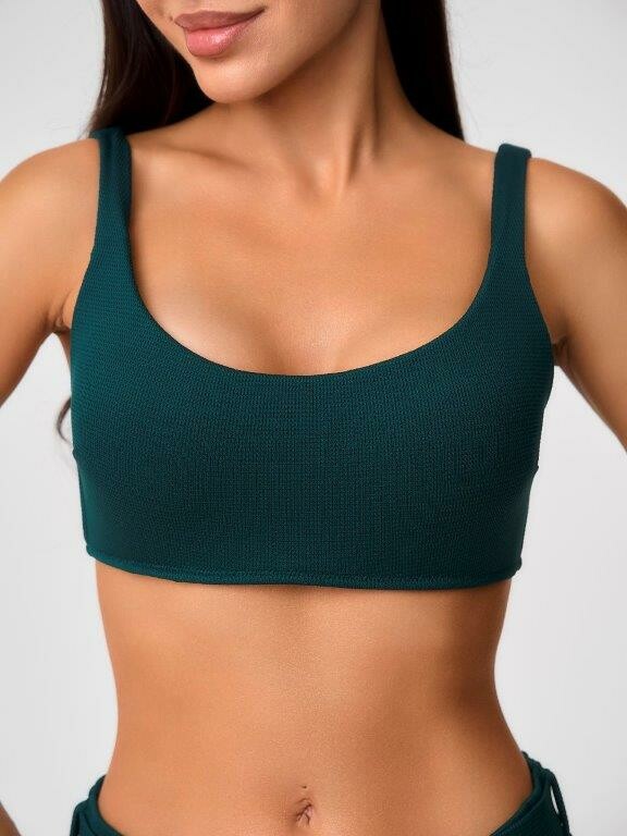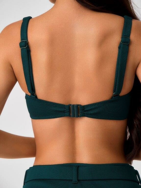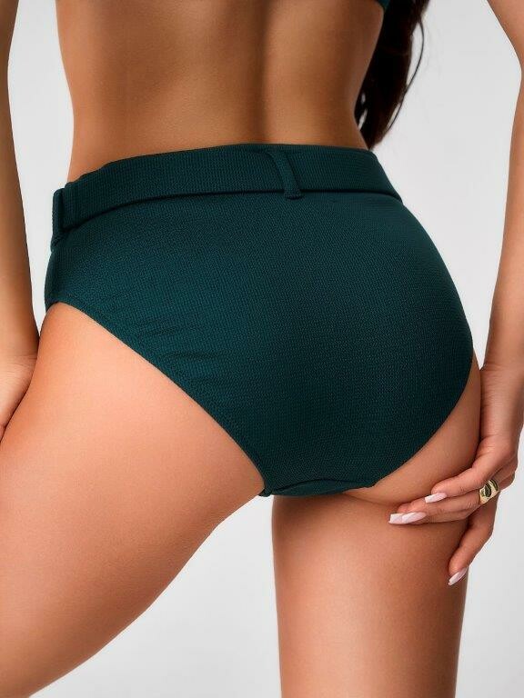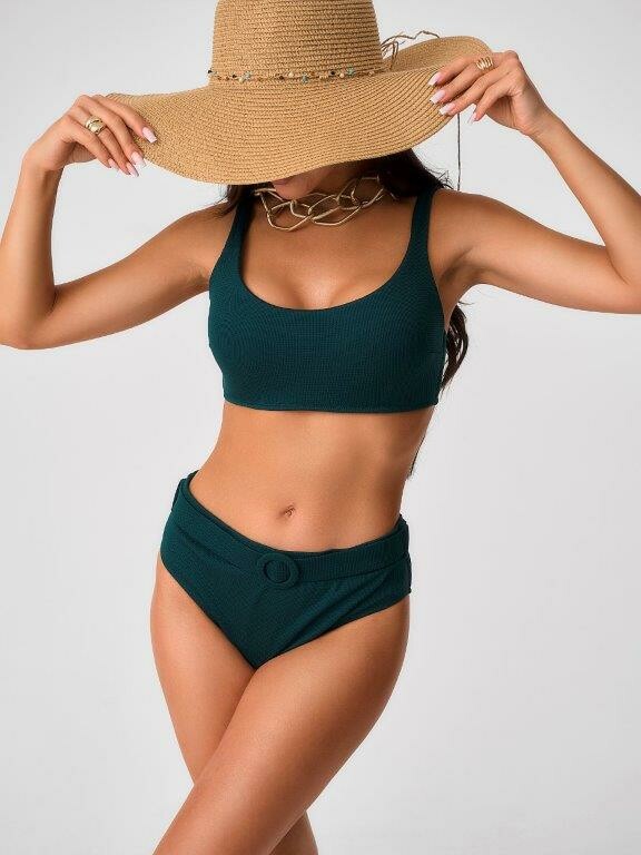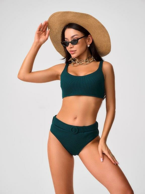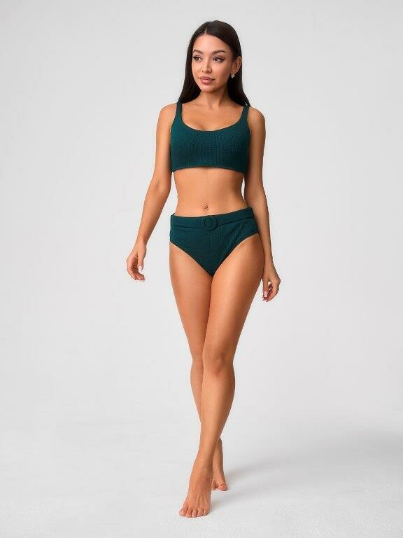 Раздельный купальник с формованнй чашкой soft bra из фактурного полотна. Бюстгальтер с мягкой чашкой из тонкого формованного поролона. Без каркасов, с боковыми корсетными вставками. Бретели широкие, не съемные,регулируемые. Пластиковая застежка. Плавки на подкладе с завышенной линией талии. Эластичный пояс по линии талии с декоративной пряжкой из ткани купальника. Тонкая резинка, подгиб и плоский шов по талии и срезу ножек.