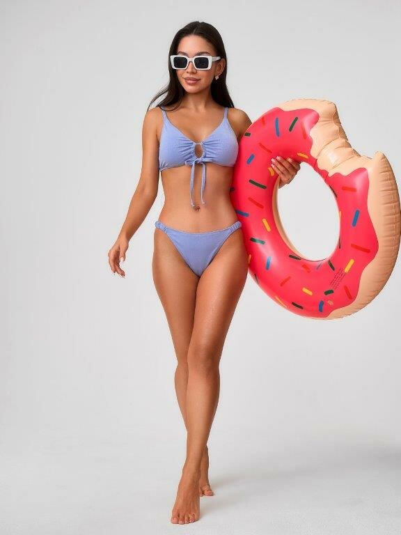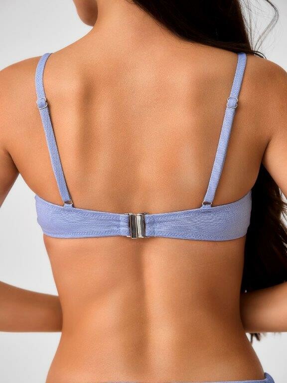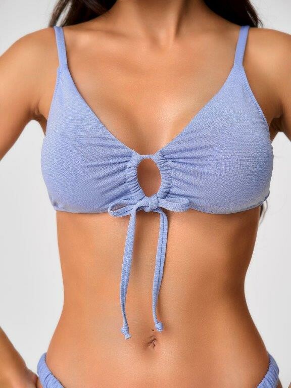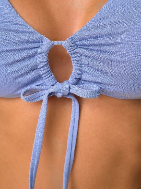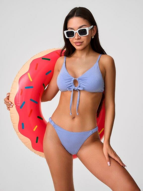 Раздельный купальник из эластичного полотна на подкладе с блеском с мягкой чашкой soft bra. Мягкая чашка со съемными формованными вкладышами.Бюстгалтер без каркасов и без боковых корсетных вставок Спереди декоративная завязывающаяся лента. Бретели регулируемые, не съемные. Металлическая застежка. Трусики с завышенной талией на подкладе. По бокам декоративные резинки из ткани купальника. Тонкая резинка, подгиб и плоский шов по талии и срезу ножек.
