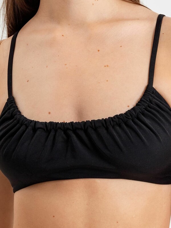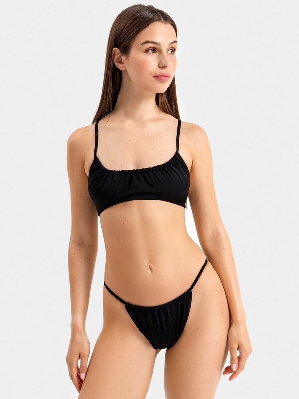 Деталь лифа цельная со сборкой по горловине из трикотажного полотна, с отрезным бочком. Проймы и низ -обтачаны подкладкой с прокладыванием эластичной тесьмы по срезу. Срез горловины обработан швом вподгибку с протянутой внутрь бретелью из основного полотна (внутри резиновая эластичная тесьма), переходящей на спинку. Бретель регулируемая, съемная по спинке. По спинке застежка. Трусы купальные бразилиано со средней линией талии. Ластовица и фронтальная часть на подкладке. Верхний срез фронтальной детали обработан швом вподгибку с протянутой внутрь протяжкой из основного полотна (внутри резиновая эластичная тесьма). Протяжка переходит на бочки и соединяется с задней деталью. Ножки фронтальной детали обтачаны подкладкой с эластичной тесьмой внутри (резиновая эластичная тесьма). Задняя деталь со средним швом, со сгибом по ножкам. Верхний срез обработан швом вподгибку с эластичной тесьмой внутри (резиновая эластичная тесьма). 80% полиамид; 20% эластан Материал подкладки: полиамид Модель лифа: на бретельках Модель трусов: бразильяна Назначение белья/купальника: пляж Особенности модели: нет Пол: Женский Предмет: Костюмы купальные Уход за вещами: деликатная стирка при 30 градусах Чашка: мягкая фактура материала: полотно трикотажное эластичное Комментарии к товару