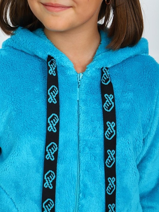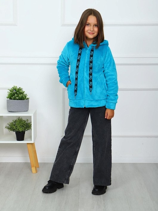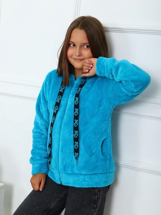 Детская куртка выполнена из полотна "велсофт". Куртка прямого покроя на молнии, с капюшоном, рукав на манжете, низ куртки на поясе, в боковых швах находятся карманы, на шнур капюшона, в качестве декоративного элемента, нашиты бомбошки.