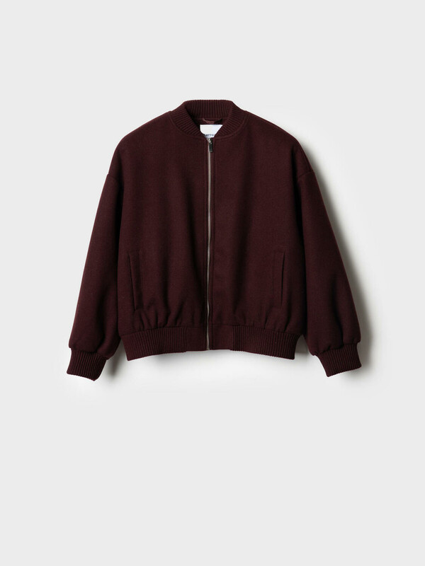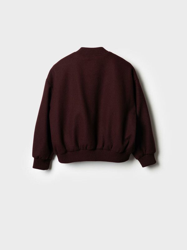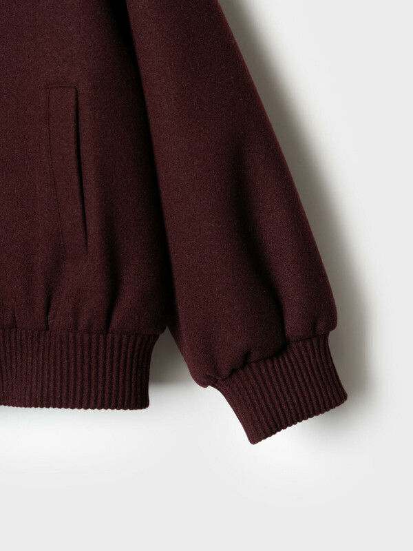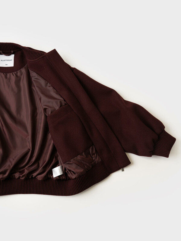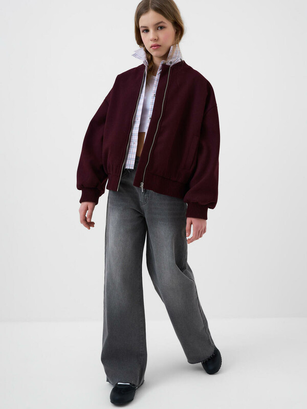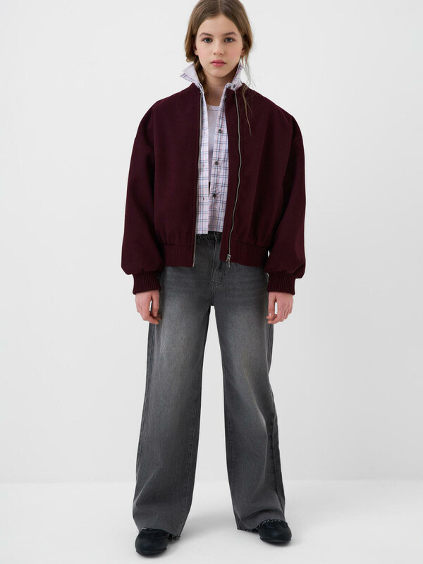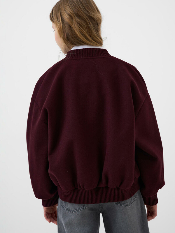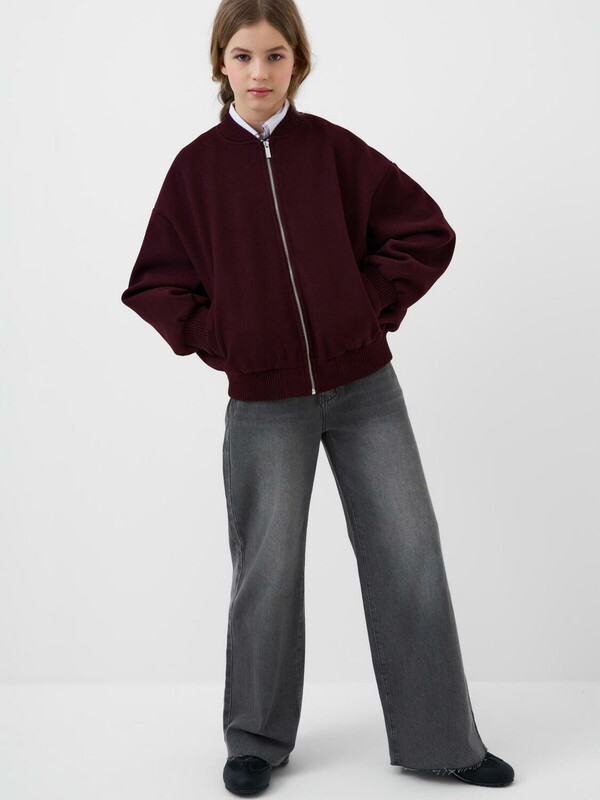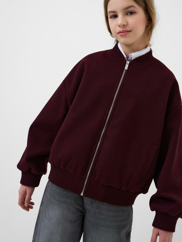 Бомбер оверсайз для девочки подростка. Температурный режим от +10 до +20С. Выполнен из плотной ворсистой ткани винного оттенка. Внутри гладкая подкладка. На воротнике, манжетах и по низу изделия — широкая трикотажная резинка. Два боковых кармана. Внутренний карман на липучке. Изделие предназначено для весенне-осеннего сезона.