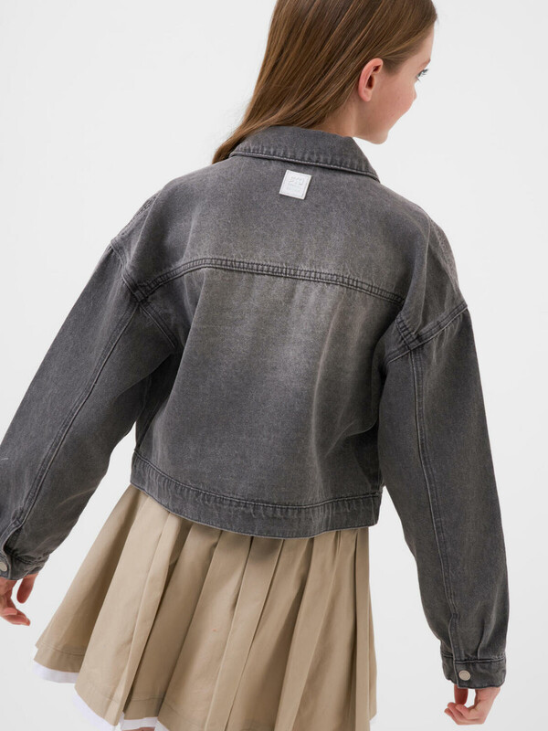 Джинсовая куртка для девочки подростка. Модель выполнена из плотного варёного денима серого цвета. Куртка свободного кроя, длина — чуть выше талии. Спереди расположены два накладных кармана на кнопках. Застежка по центру — на металлических кнопках. Рукава с манжетами на кнопках. Спинка украшена декоративной нашивкой. Низ куртки оформлен необработанным срезом с бахромой.