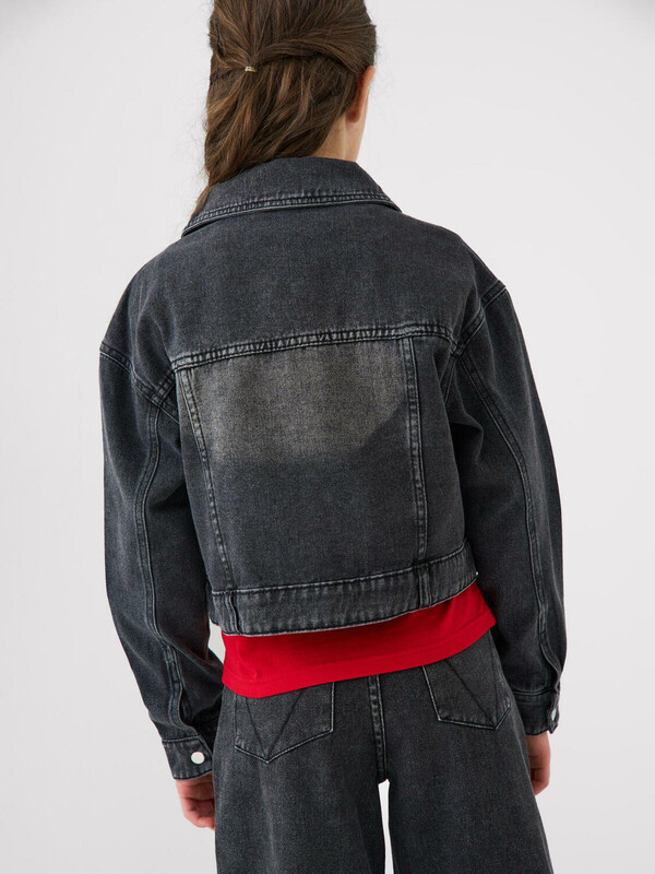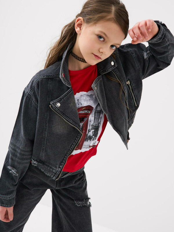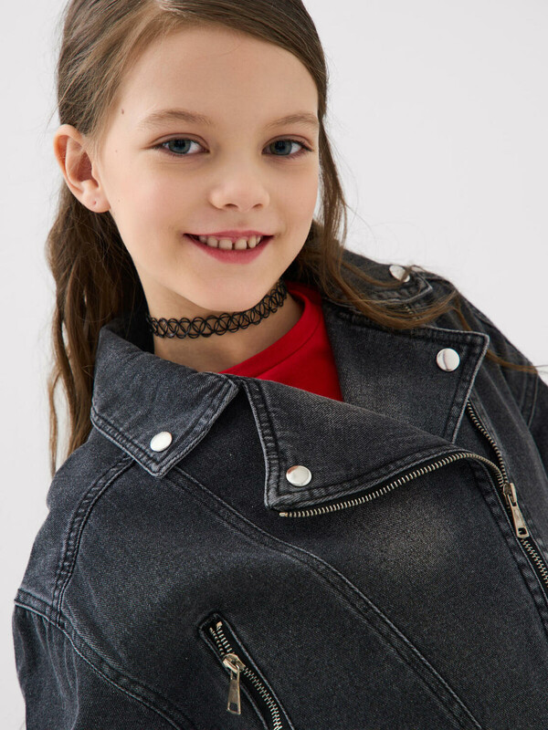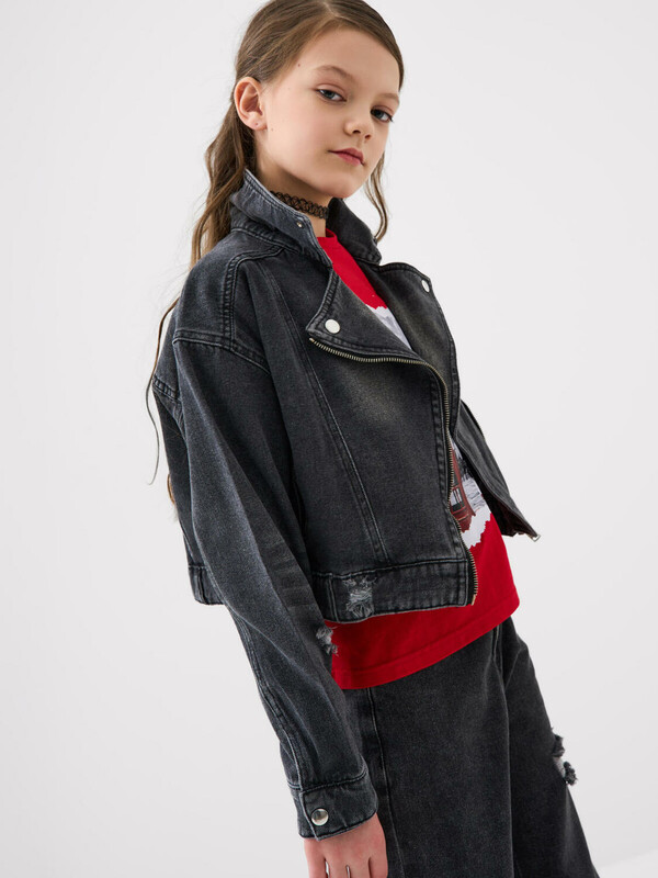 Джинсовая куртка в байкерском стиле для девочки подростка. Изделие выполнено из плотного тёмно-серого денима с декоративными потертостями, высветлениями и рваными элементами. Спереди расположена косая застежка-молния и два кармана на молниях. Воротник с лацканами украшен металлическими кнопками. Рукава с манжетами на кнопках.