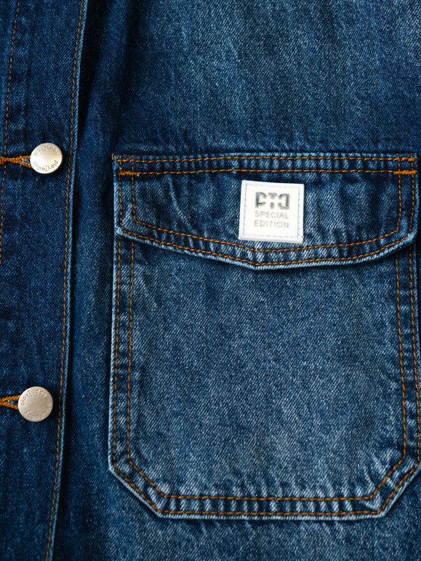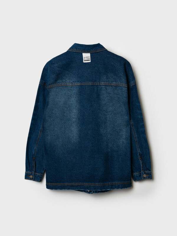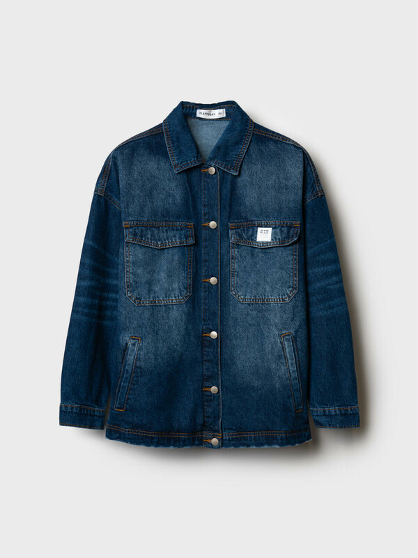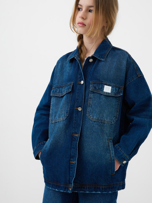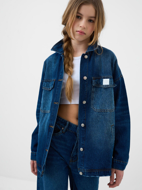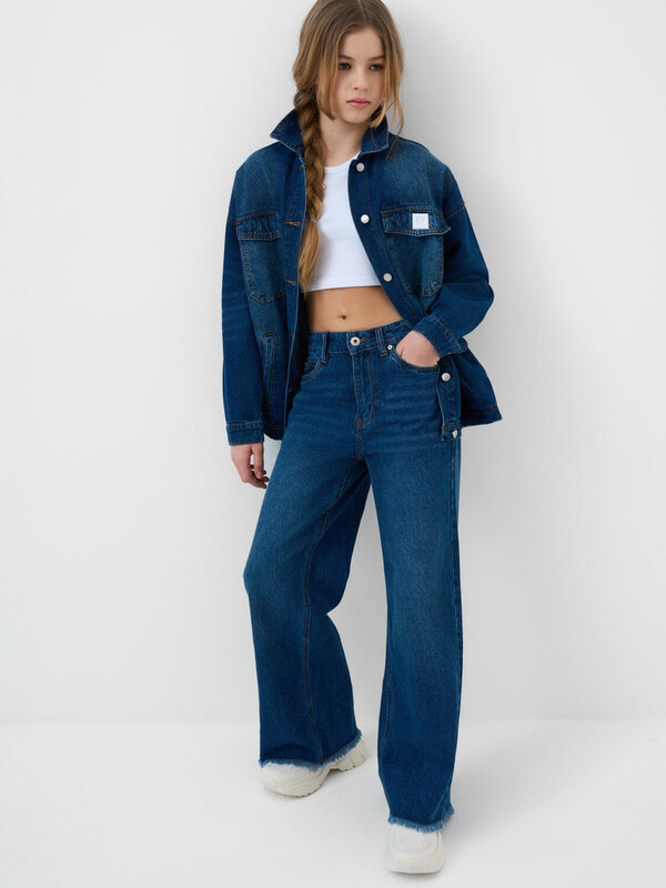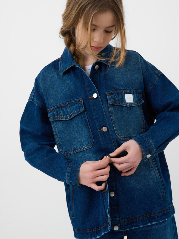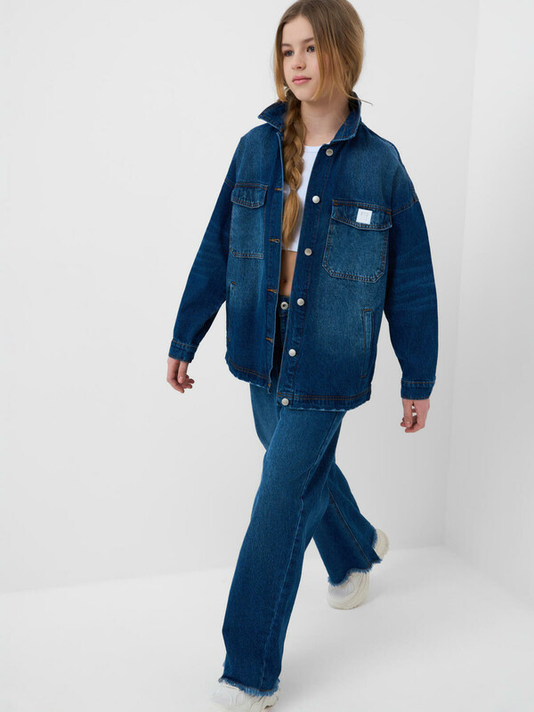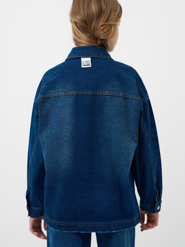 Производитель: PlayToday Джинсовая куртка оверсайз для девочки подростка. Выполнена из плотного синего денима. Спереди два накладных кармана и два боковых кармана. Застёгивается на металлические болты. На груди — фирменный резиновый логотип, а на спине под воротником — жаккардовая нашивка. Манжеты застёгиваются на кнопки. Низ изделия с бахромой.