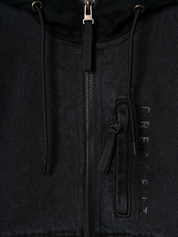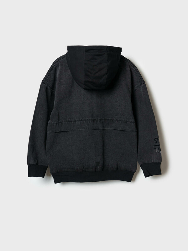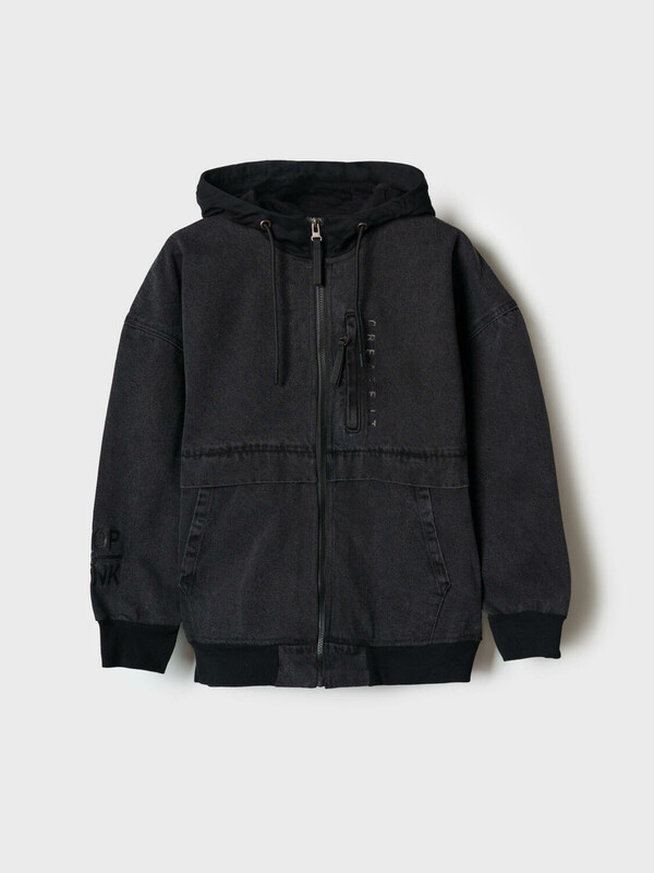 Джинсовая легкая куртка свободного кроя с удлиненным рукавом и капюшоном для мальчика подростка. Бомбер оверсайз джинсовый выполнен в графитовом оттенке с чёрными акцентами на капюшоне и манжетах. Капюшон регулируется шнурком. Спереди — застежка на молнию, два удобных кармана и вертикальный принт. На правом рукаве расположен дополнительный принт. Светоотражающие элементы на груди и спинке обеспечивают безопасность в темное время суток. Куртка выглядит современно и подходит для повседневного городского образа.