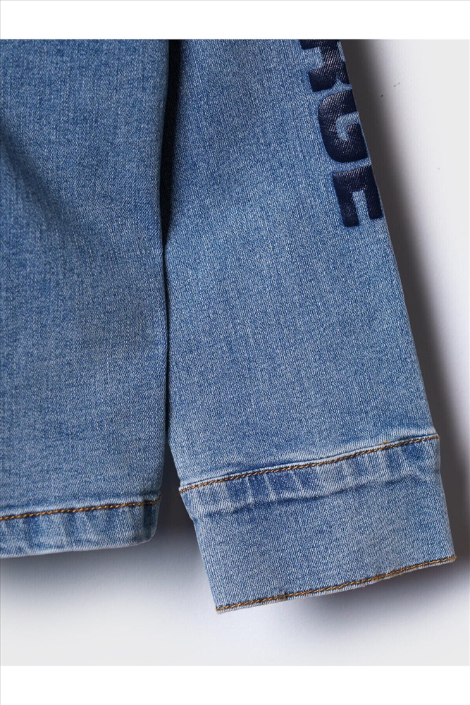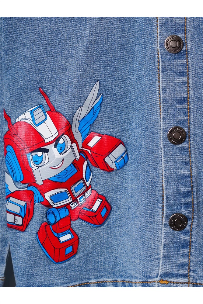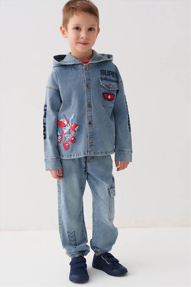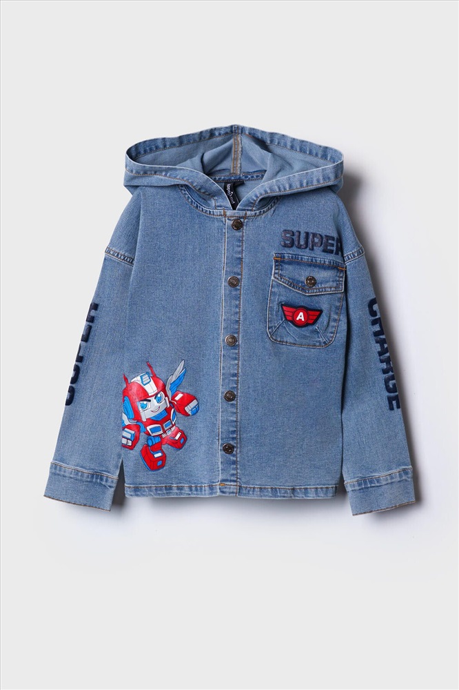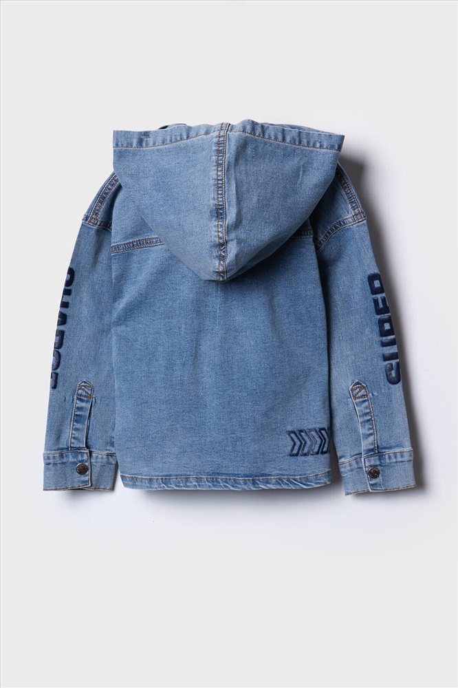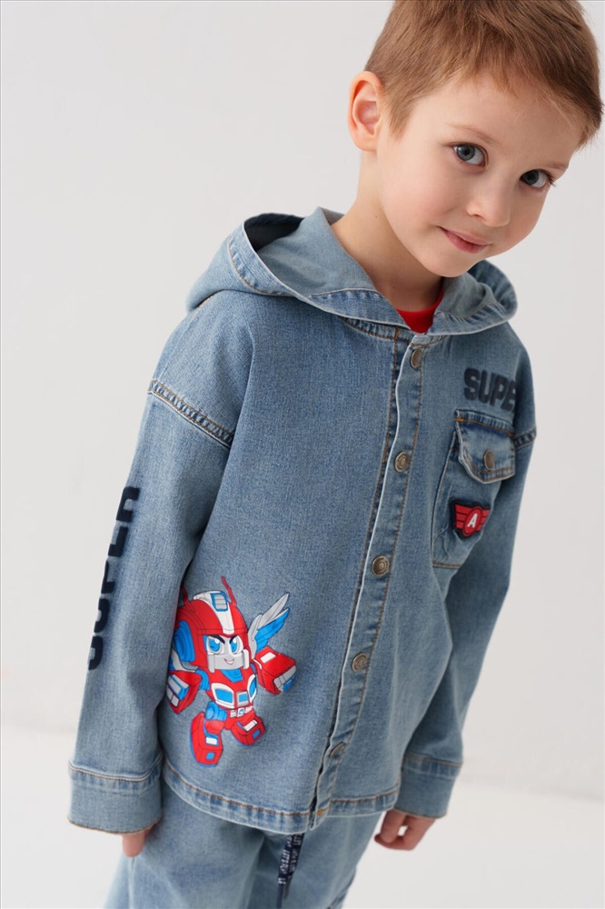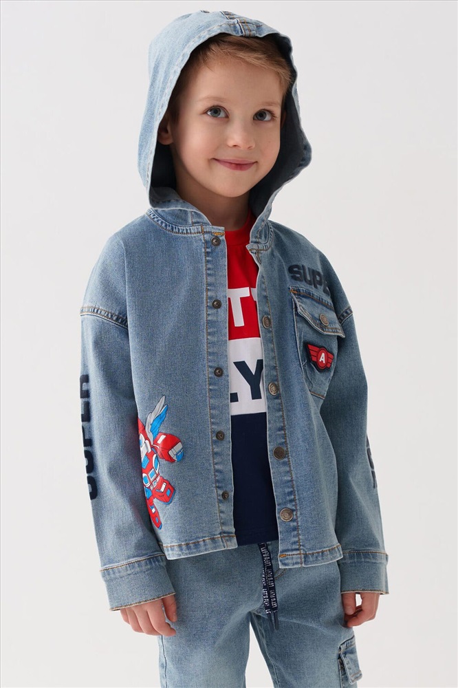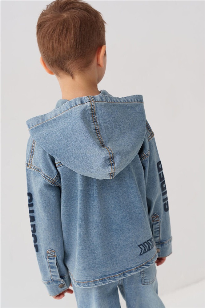 ID товара: 1240553 Состав: 70% хлопок, 28% полиэстер, 2% эластан Сезон: Весна/Лето Детская джинсовая оверсайз куртка-рубашка с капюшоном для мальчика. Модель выполнена из светло-голубого денима. Свободный крой, застежка на кнопки. На груди — накладной карман. В оформлении использованы яркие принты. Сзади — декоративные стрелки. Комментарии к товару