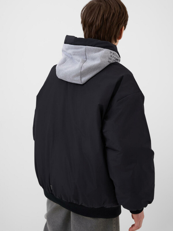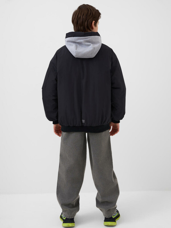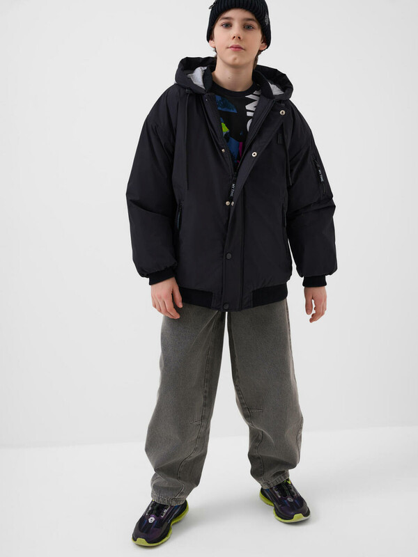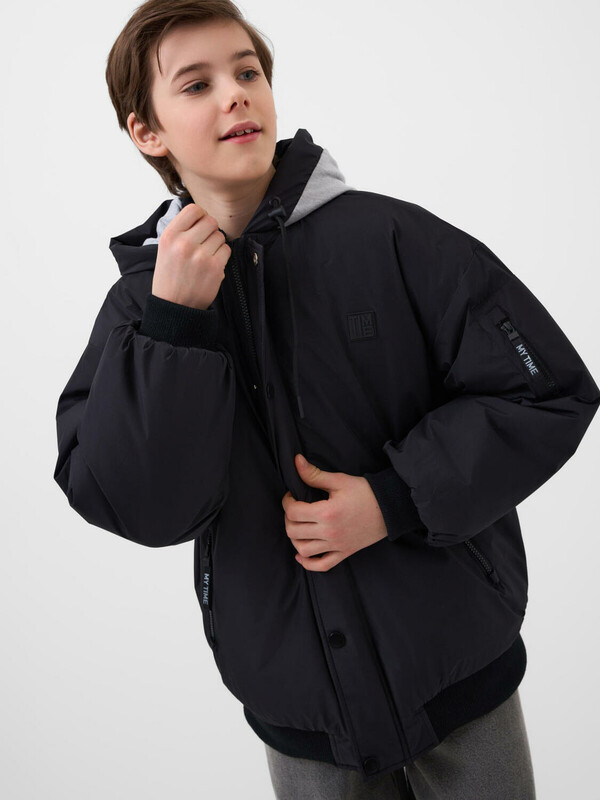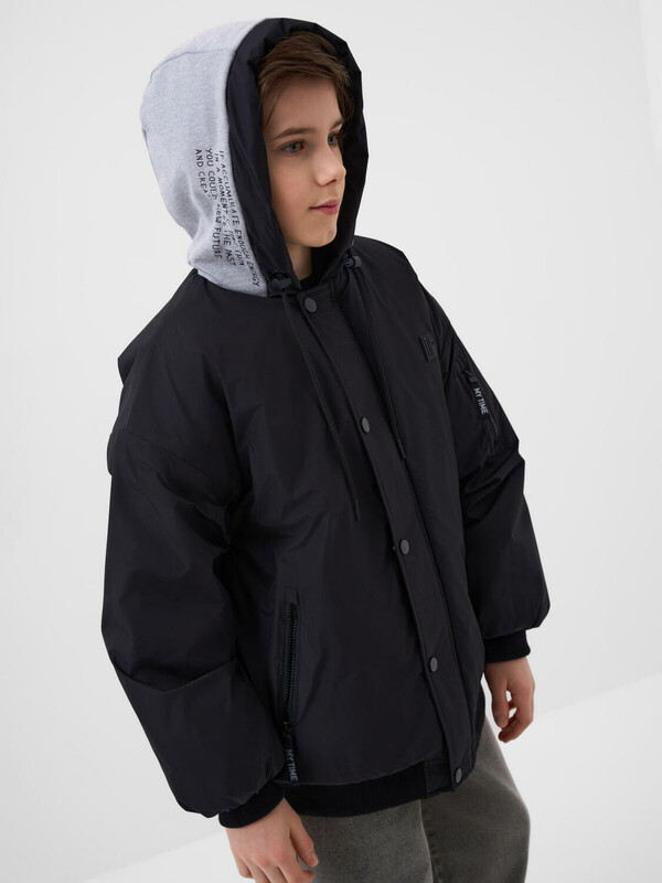 Лёгкая оверсайз куртка, выполненная в спортивном стиле для мальчика подростка. Температурный режим от +15°C до 0°C. Гладкая подкладка. Свободный крой и длину до бёдер. Застёжка на кнопках. Капюшон со шнуром для регулировки. На груди — чёрная резиновая нашивка. На рукаве и по бокам расположены карманы на молнии. Внутренний карман на липучке. На спинке — светоотражающая нашивка для безопасности в ночное время суток. Манжеты и нижний край выполнены из риба, что обеспечивает комфортную посадку.