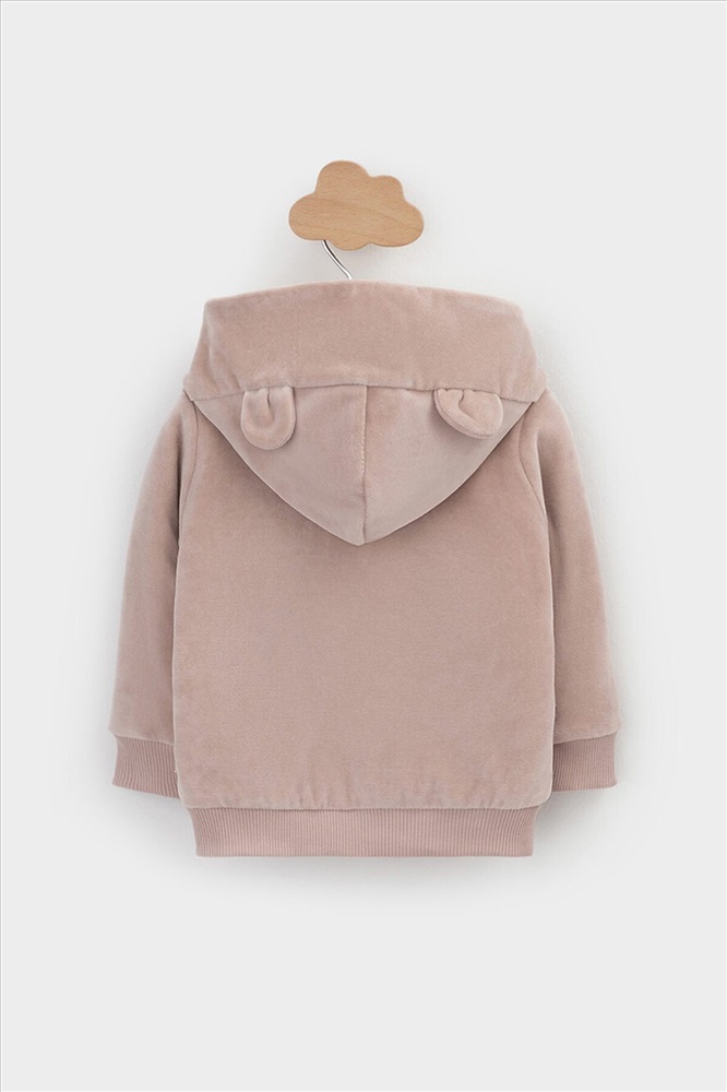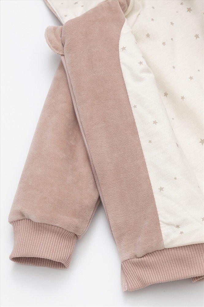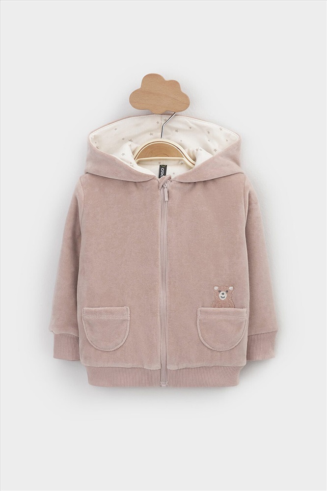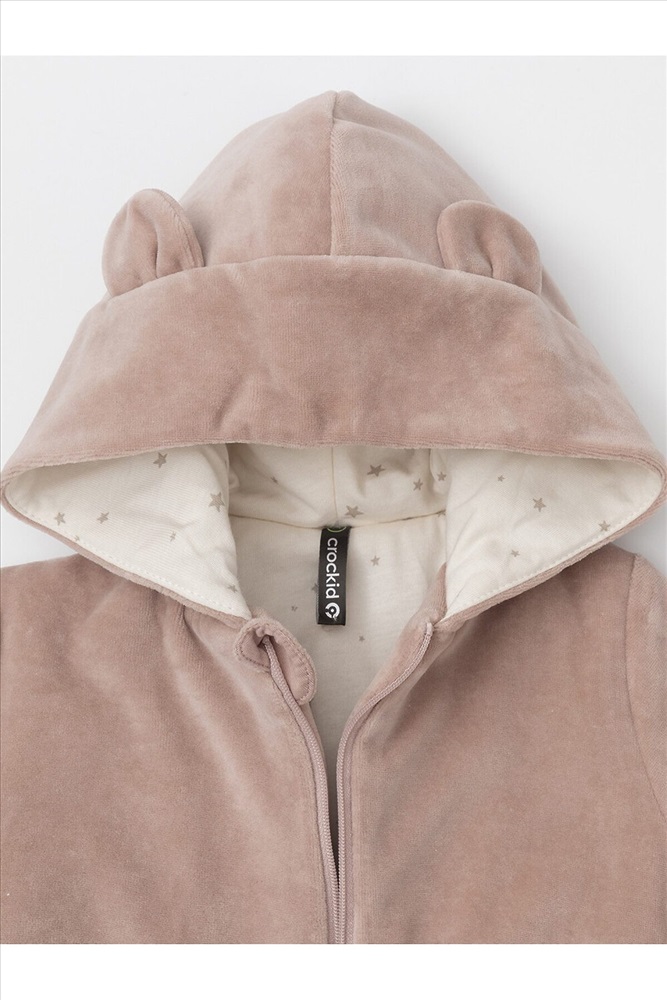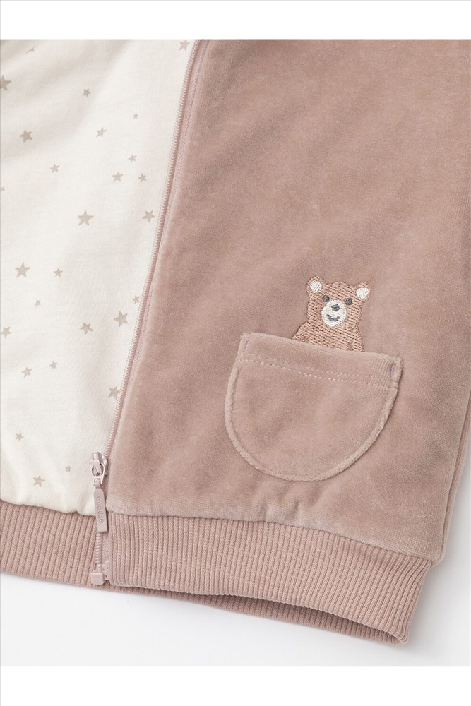 Тёплая куртка из велюра для новорождённых. Внутри синтепон и подклад из натурального хлопка. Изделие застёгивается на молнию и имеет капюшон. На рукавах мягкие манжеты, внизу - эластичный пояс. Спереди два накладных кармана и украшение в виде вышивки. Все трикотажные полотна производятся в соответствии с нормами Швейцарского сертификата ЭкоТекс.