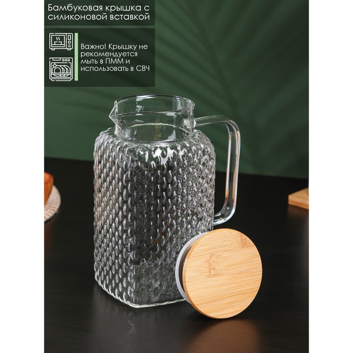 Габариты: 15 x 15 x 22 Страна: Китай В боксе: 36 шт Состав: Бамбук, силикон, стекло, коррозионностойкая сталь Материалы: бамбук, силикон, стекло, Коррозионностойкая сталь Фасовка: по 1 шт Индивидуальная упаковка: Картонная коробка Габариты товара: 15 см × 15 см × 22 см Сертификат: СТР Набор: Нет Цвет: Прозрачный Объём, л: 1,5 Тематика: Однотонная Рисунок: Нет Материал крышки: Дерево Материал: Стекло Можно мыть в посудомоечной машине: Да Можно использовать в СВЧ-печи: Нет Текстура: С рельефом Особенности: Без особенностей Кувшин для воды, чая, лимонада, морса, прохладительных и горячих напитков станет оригинальным украшением вашего стола. Фактурное стекло выглядит эффектно, а бамбуковая крышка оснащена фильтром, чтобы ягоды, фрукты и другие ингредиенты не попали в бокалы. Вы можете использовать данную модель как для холодных, так и для согревающих напитков. ОРИГИНАЛЬНЫЙ ДИЗАЙН: Кувшин специально разработан для воды, морсов, соков, молока, коктейлей или любых других ваших любимых напитков. Фактурное стекло эффектно дополняет продуманный силуэт. НАИЛУЧШЕЕ КАЧЕСТВО: Прочный, термостойкий и легкий. Кувшин из прозрачного стекла изготовлен из высококачественного термостойкого стекла. Этот прочный стеклянный графин можно использовать долгое время. ЛЕГКО ЧИСТИТЬ: Стекло легко чистится, крышка снимается. Графин не впитывает и не выделяет запахи. Кроме того, его можно мыть в посудомоечной машине без крышки. ОПТИМАЛЬНЫЙ РАЗМЕР: Идеально для 4-5 человек. БЕЗОПАСНОСТЬ: Стеклянная посуда полезна для здоровья, поскольку стекло не содержит бисфенола А и свинца, оно безопасно для здоровья. ДополнительноМожно мыть в посудомоечной машине без крышки. Комментарии к товару