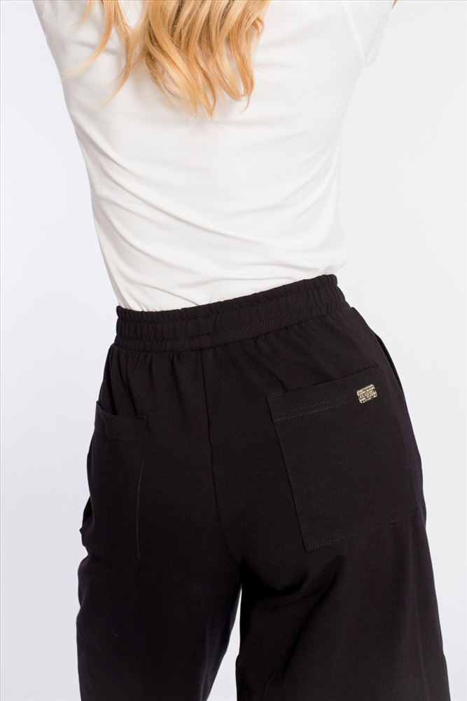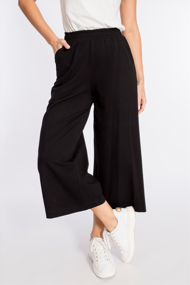 Кюлоты выполнены из кулирки с лайкрой. Силуэт брюк широкий, свободный. Пояс на резине, спереди и сзади размещено по два кармана.