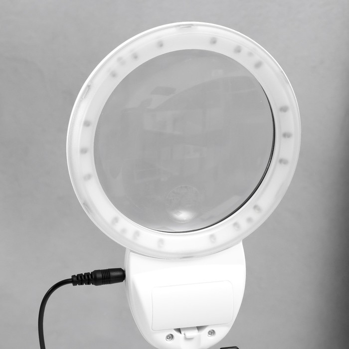 - Мощная LED-подсветка: 18 светодиодов обеспечивают равномерное освещение без теней. Световой поток — до 2500 лм, что соответствует яркости дневного света. Работает от USB или от 3 батареек ААА — можно использовать дома, в мастерской или брать с собой.