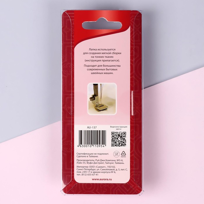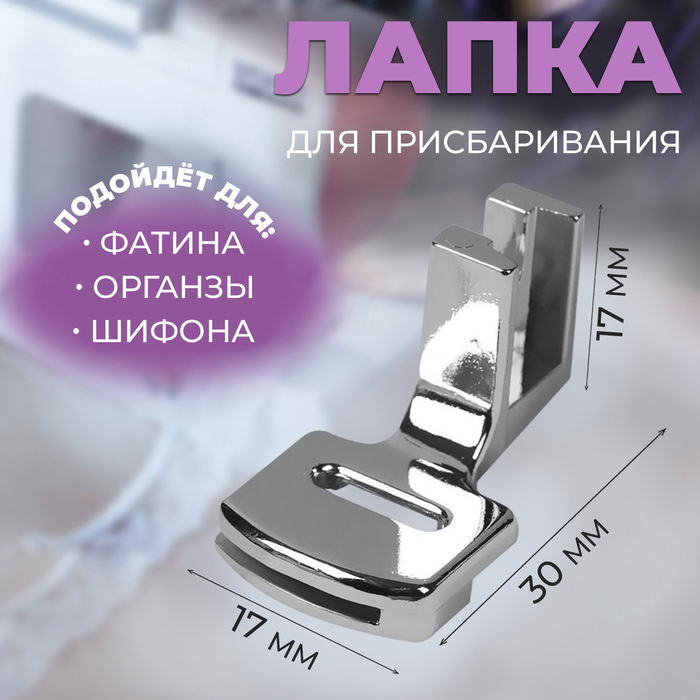 Габариты: 15 x 6,5 x 1,8 Страна: Китай В боксе: 18 шт Состав: Металл Материалы: металл Фасовка: по 1 шт Индивидуальная упаковка: Блистер Сертификат: Не подлежит сертификации Набор: Нет Материал: Металл Вид: Лапки для бытовых машин Фиксированная цена: Да Лапка с адаптером предназначена для создания мягкой сборки на очень тонких и эластичных материалах. Используется для присбаривания края ткани и одновременно пришивания его к основному изделию. Подходит для большинства современных бытовых швейных машин: