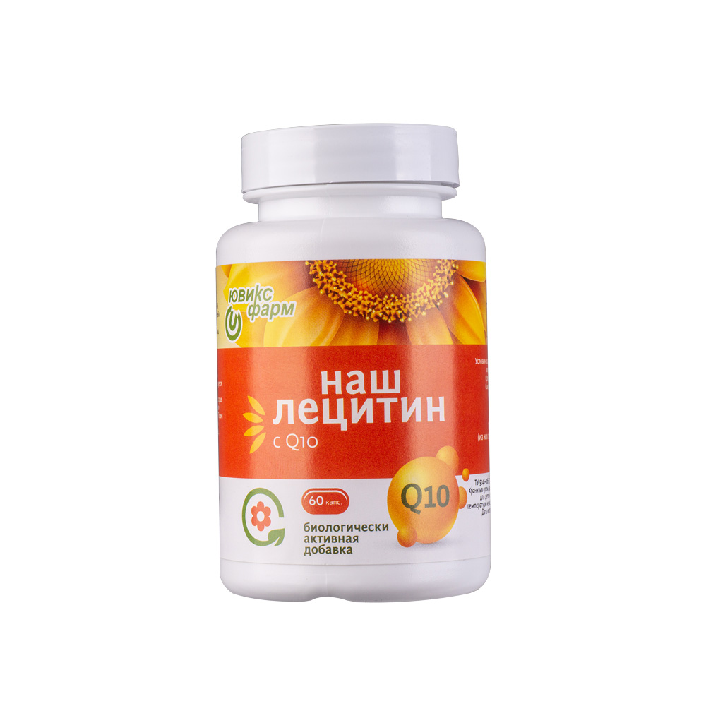 Состав: лецитин из подсолнечника, коэнзим Q10, оболочка капсулы (желатин). Показания: заболевания сердечно сосудистой системы; послеоперационный период; склеивание (слипание) тромбоцитов; вязкость крови; повышенные физические нагрузки; быстрая утомляемость; снижение памяти, рассеянность внимания; стрессовые состояния; нарушения деятельности нервной системы; реабилитация после травм и инфекционных заболеваний; кожные заболевания. Противопоказания: Индивидуальная непереносимость компонентов БАД, беременность, кормление грудью. Предупреждение: С осторожностью принимать при желчнокаменной болезни. Рекомендации: Взрослым и детям старше 14 лет по 2 капсулы 2 раза в день во время до еды. Продолжительность приема: 1-2 месяца. Приём можно повторять 2-3 раза в год. Выше указаны минимальные дозы и сроки приёма ‘Наш Лецитин с Q 10’. Также, из-за недостатка получения лецитина из пищи рекомендовано чередовать приём этого препарата с БАД ‘Наш Лецитин’. Перед приемом БАД рекомендуется проконсультироваться с врачом. Среди веществ, крайне необходимых для организма, можно отметить два, которые трудно восполнить обычной диетой. Это эссенциальные фосфолипиды и коэнзим Q10. Эссенциальные фосфолипиды (ЭФ) представлены преимущественно фосфатидилхолином (лецитином). Они входят в состав мембран абсолютно всех клеток организма, обеспечивая их подвижность и способность пропускать необходимые вещества внутрь клеток. ЭФ, т.е. лецитин, являются жирорастворимыми и, при соблюдении диеты с ограничением жиров, не могут поступать в организм естественным путем. Поэтому важно получать это незаменимое вещество изолированно от жирных продуктов. Что касается коэнзима Q10 – это универсальный кофермент, участвующий в образовании энергетического вещества АТФ во всех клетках организма. Практически все метаболические превращения в организме направлены на получение волшебных молекул АТФ, которые являются основным запасом энергии. Коэнзим Q10 (или кофермент Q10 и убихинон) можно определить как проводника энергии ЦИ или ПРАНЫ, определяющую в восточной медицине продолжительность жизни (застой этой энергии приводит к болезни, а исчезновение к летальному исходу). К сожалению, в традиционных продуктах питания количество коэнзима Q10 очень мало, а так как он тоже жирорастворимый, то ограничение приема жиров еще больше ограничивает возможность его поступления с продуктами питания. К сожалению, статины, широко применяемые для снижения уровня холестерина в крови, блокируют образование коэнзима Q10. Возникающий дефицит коэнзима Q10 играет ключевую роль в формировании и прогрессировании сердечной недостаточности, развитии синдрома «выгорания», раннем старении организма, а поступление его в организм позволяет продлить жизнь даже очень тяжелобольным людям, замедлить старение и улучшить качество жизни. Восполняют дефицит коэнзима в организме помогают продукты питания: жирная морская рыба, шпинат, бобовые, яйца, необработанный рис, свежие овощи и фрукты. Биоактивные препараты коэнзима применяются при нарушении процессов синтеза его в организме, а также в профилактических целях. Курсовой прием коэнзима Q10 решает следующие проблемы со здоровьем: Улучшает работу сердечно-сосудистой системы. Нормализует повышенное давление. Нормализует состояние нервной системы. Укрепляет 