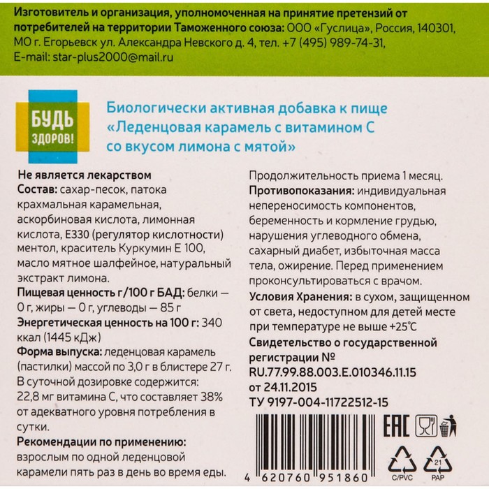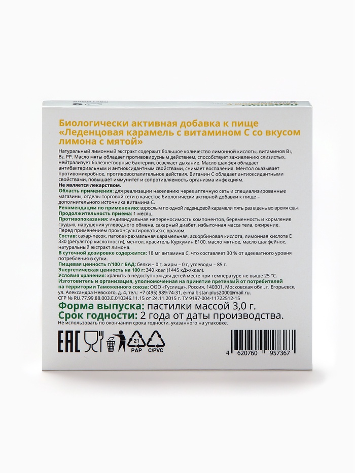 Габариты: 10 x 9,5 x 1,8 Страна: Россия В боксе: 90 шт Состав: См. на упаковке Материалы: см. на упаковке Фасовка: по 1 шт Индивидуальная упаковка: Картонная коробка / упаковка Сертификат: ЕАС Вес, г/Объём, мл: 50 Показания: Боль в горле Действие: Общеукрепляющее, Обезболивающие Данный продукт предлагается как дополнительное вспомогательное средство при заболеваниях верхних дыхательных путей практически для любого возраста, кроме детей до 3 лет. Противопоказания: индивидуальная непереносимость компонентов, беременность и кормление грудью, нарушения углеводного обмена, сахарный диабет, избыточная масса тела, ожирение. Перед применением проконсультироваться с врачом. Комбинированный препарат растительного происхождения с противовоспалительным и отхаркивающим действием. Входящий в состав препарата ментол оказывает спазмолитическое и антисептическое действие. Комментарии к товару