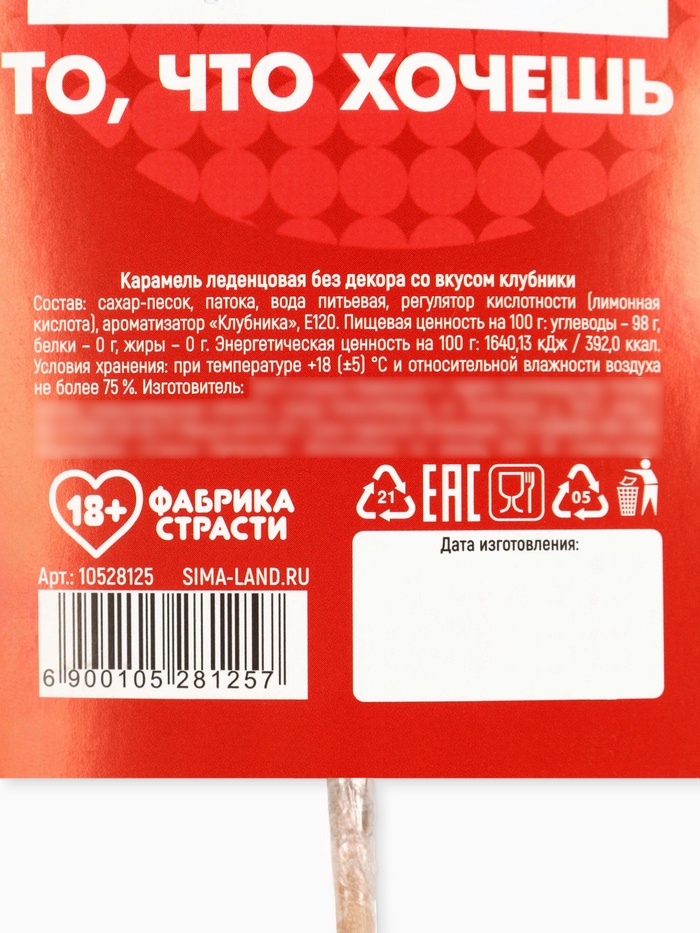 Габариты: 17 x 8 x 1,5 Страна: Россия В боксе: 250 шт Состав: См. на упаковке Материалы: см. на упаковке Фасовка: по 1 шт Индивидуальная упаковка: Цветная коробка Сертификат: ЕАС Цвет: Красный Вес нетто, г: 20 Тематика праздника: Новый год Вкус: Клубника На палочке: Да ПРИ ОФОРМЛЕНИИ ЗАКАЗА, ПРОСИМ ЗАПРАШИВАТЬ АКТУАЛЬНЫЕ СРОКИ ГОДНОСТИ У МЕНЕДЖЕРА Состав: сахар, патока, вода, клубничный сироп. Пищевая ценность на 100 г: углеводы – 98,1 г, белки – 0,9 г. Энергетическая ценность на 100 г: 378,9 ккал / 1586,4 кДж. Условия хранения: при температуре +18 (±3) °С и относительной влажности воздуха 75 %. Продукт не должен подвергаться воздействию прямого солнечного света. Срок годности: 12 мес. Масса нетто: 20 г. Комментарии к товару