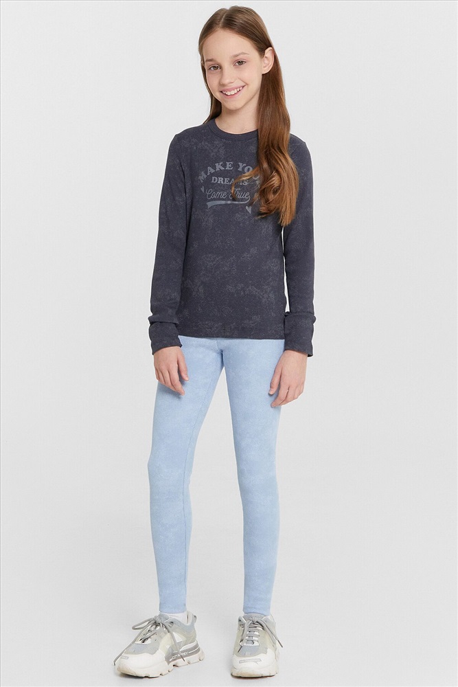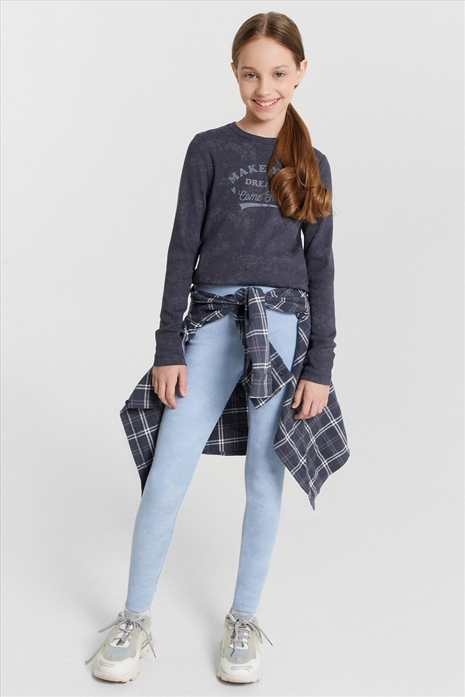 Леггинсы для девочек прилегающего силуэта. Пояс отрезной, широкий, с эластичной тесьмой внутри.Посадка высокая.