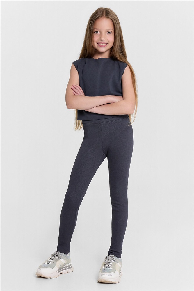 Леггинсы для девочек прилегающего силуэта. Пояс отрезной, широкий, с эластичной тесьмой внутри.Посадка высокая.