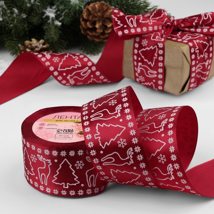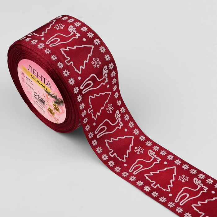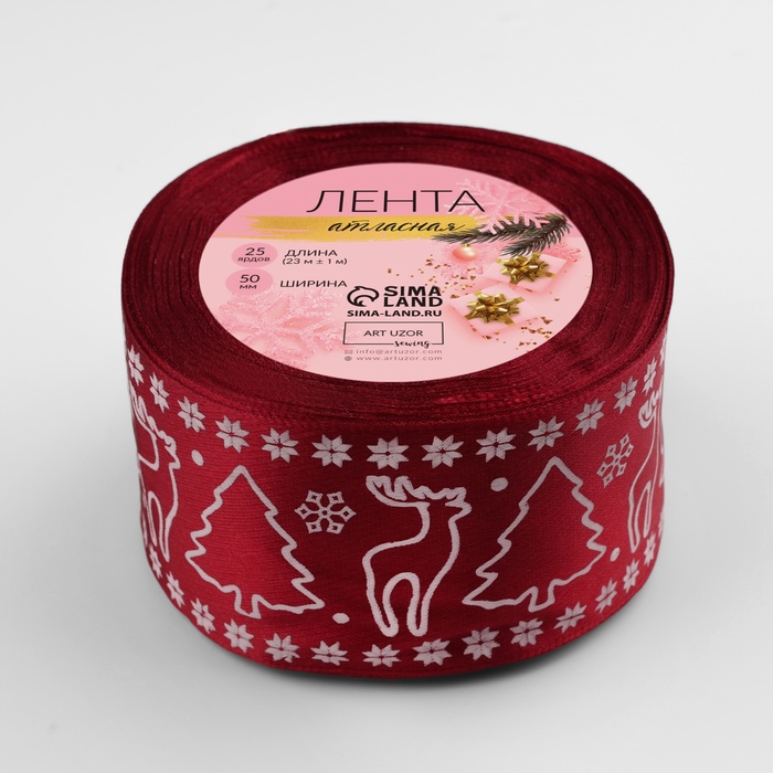 Лента атласная «Олени», 50 мм, 23±1 м, красная