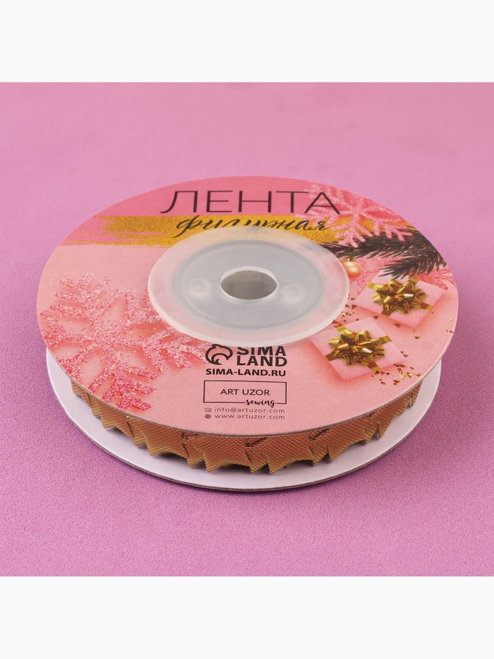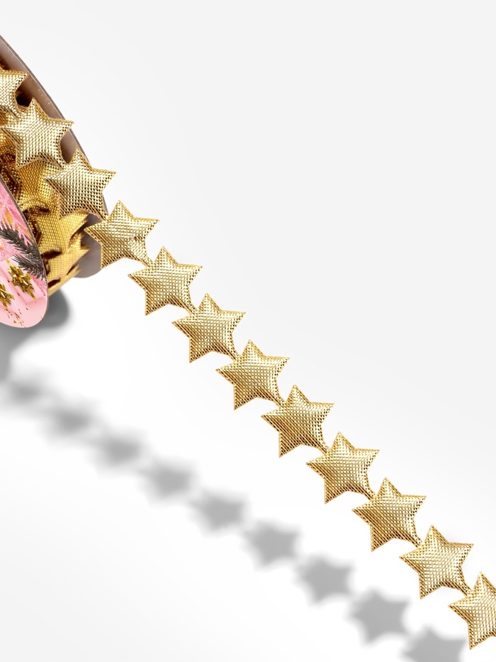 Фигурная лента «Звёзды» станет акцентом в праздничном декоре. Её мерцающий золотистый цвет гармонично сочетается с новогодней тематикой, создавая настроение тепла и торжества. Такой декоративный элемент часто используют для оформления подарков, создания гирлянд или выделения отдельных деталей в композициях. Звёздный орнамент напоминает о ночном небе, где каждая искорка подчёркивает уникальность вашего оформления.
