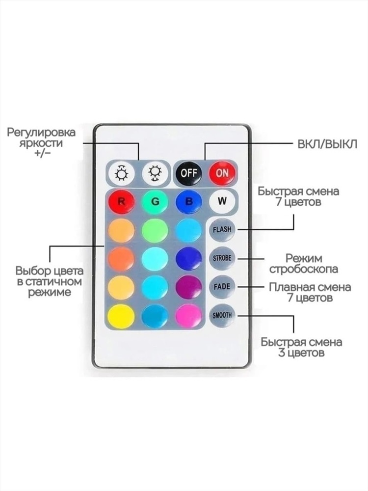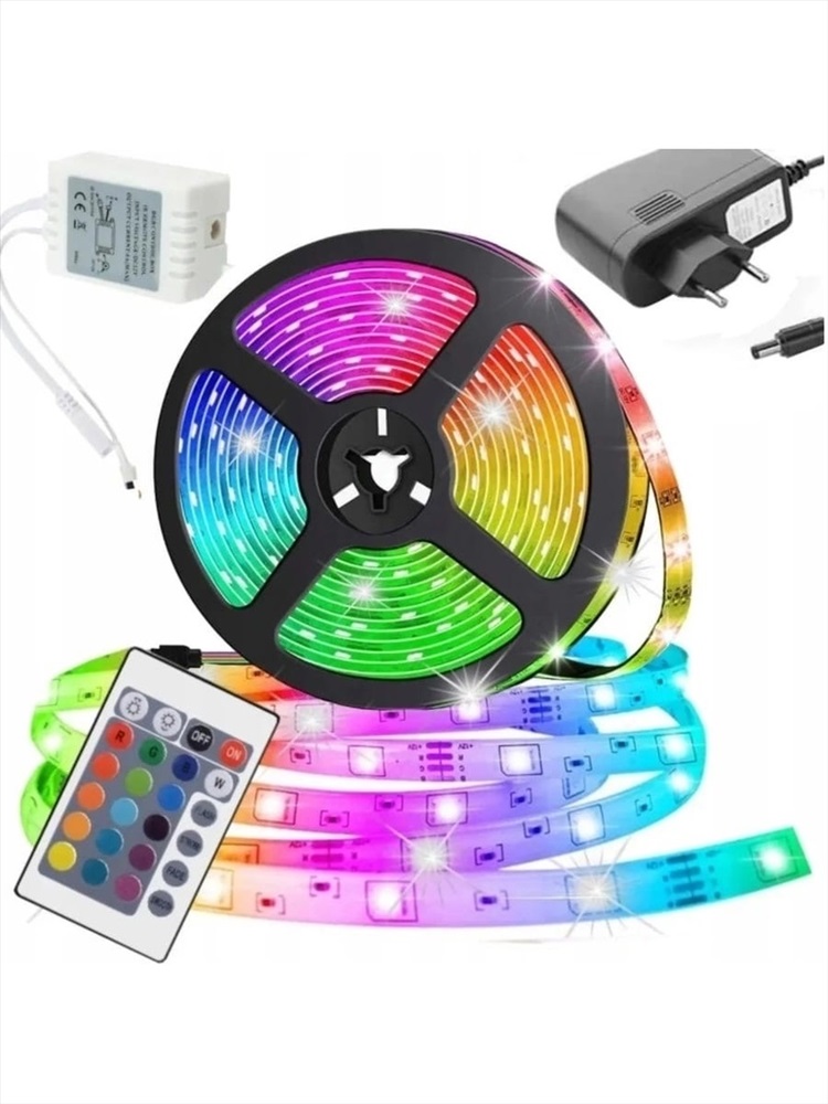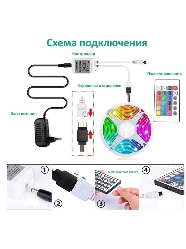 Светодиодная лента 5 метров в катушке Контроллер Адаптер питания от сети 220В (12В, 2А) Пульт с батарейкой Упаковка/инструкция