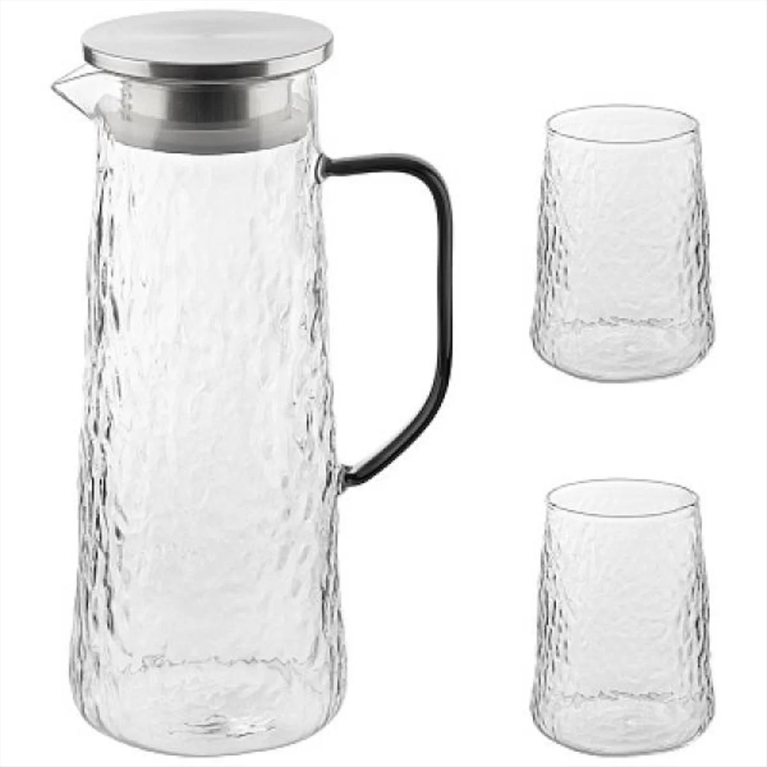 Набор из 3 предметов AROMA: кувшин 1,5 л + 2 стакана по 450 мл из боросиликатного рельефного стекла Материал: боросиликатное стекло, нержавеющая сталь, силикон. Ручка у кувшина черная (цветное стекло). Упаковка: цв коробка + пуз пленка+белая бумага+стаканы в коричневой дополнительной коробке.